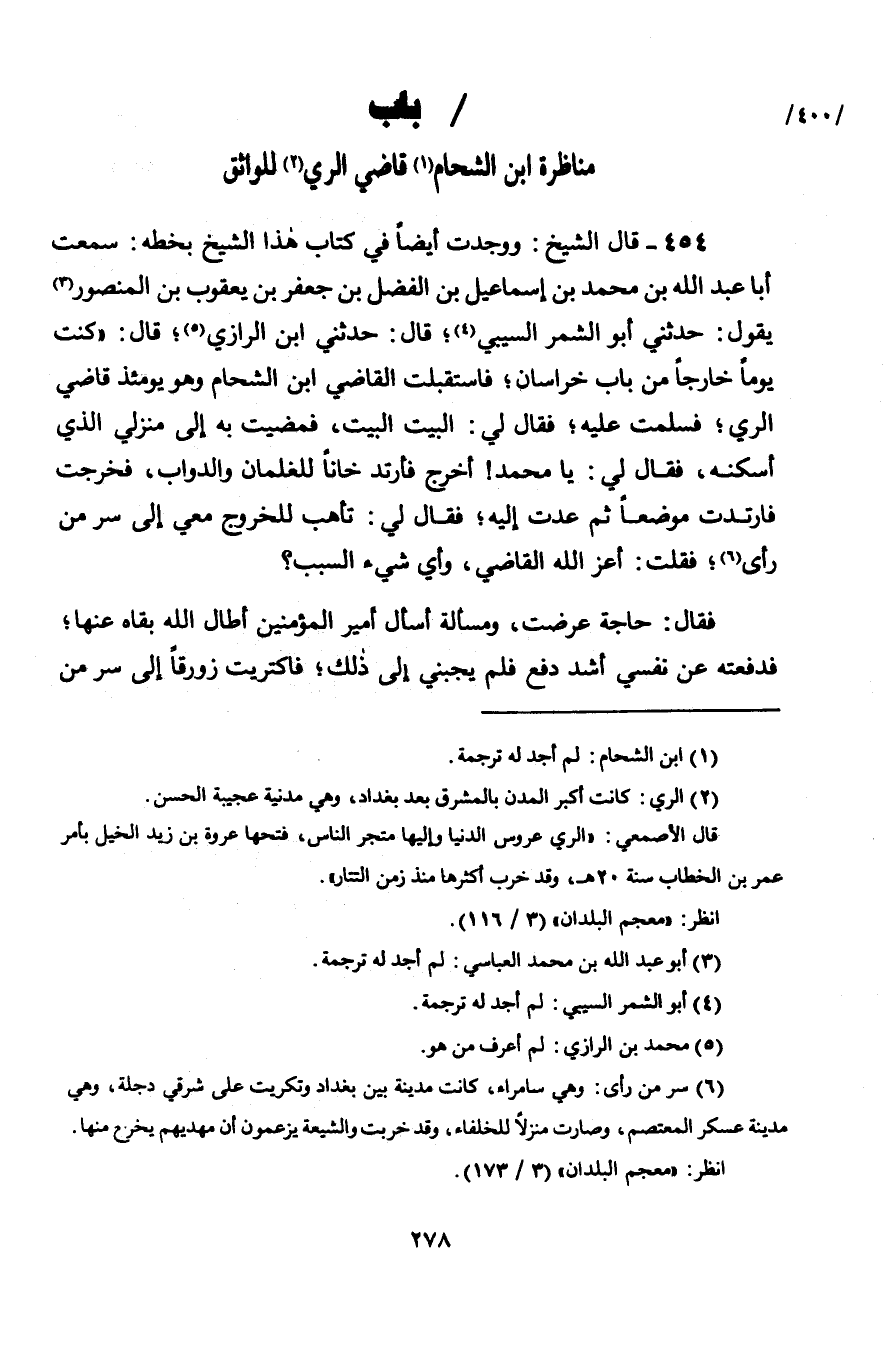 454 - قَالَ الشَّيْخُ: وَوَجَدْتُ أَيْضًا فِي كِتَابِ هَذَا الشَّيْخِ بِخَطِّهِ: سَمِعْتُ أَبَا عَبْدِ اللَّهِ بْنَ مُحَمَّدِ بْنِ إِسْمَاعِيلَ بْنِ الْفَضْلِ بْنِ جَعْفَرِ بْنِ يَعْقُوبَ بْنِ الْمَنْصُورِ، يَقُولُ: حَدَّثَنِي أَبُو الشِّمْرِ السِّيبِيُّ قَالَ: حَدَّثَنِي ابْنُ الرَّازِيِّ قَالَ: " كُنْتُ يَوْمًا خَارِجًا مِنْ بَابِ خُرَاسَانَ، فَاسْتَقْبَلْتُ الْقَاضِيَ ابْنَ الشَّحَّامِ وَهُوَ يَوْمَئِذٍ قَاضِي الرَّيِّ، فَسَلَّمْتُ عَلَيْهِ، فَقَالَ لِيَ: الْبَيْتَ الْبَيْتَ، فَمَضَيْتُ بِهِ إِلَى مَنْزِلِي الَّذِي أَسْكَنُهُ، فَقَالَ لِي: يَا مُحَمَّدُ اخْرُجْ فَارْتَدْتُ خَانًا لِلْغِلْمَانِ وَالدَّوَابِّ، فَخَرَجْتُ فَارْتَدْتُ مَوْضِعًا ثُمَّ عُدْتُ إِلَيْهِ، فَقَالَ لِي: تَأَهَّبْ لِلْخُرُوجِ مَعِيَ إِلَى سُرَّ مَنْ رَأَى، فَقُلْتُ: أَعَزَّ اللَّهُ الْقَاضِيَ، وَأَيُّ شَيْءٍ السَّبَبُ؟ فَقَالَ: §حَاجَةٌ عَرَضَتْ، وَمَسْأَلَةٌ أَسْأَلُ أَمِيرَ الْمُؤْمِنِينَ أَطَالَ اللَّهُ بَقَاءَهُ عَنْهَا، فَدَفَعْتُهُ عَنْ نَفْسِي أَشَدَّ دَفْعٍ فَلَمْ يُجِبْنِي إِلَى ذَلِكَ، فَاكْتَرَيْتُ زَوْرَقًا إِلَى سُرَّ مَنْ -[279]- رَأَى، وَأَنْزَلْتُ فِيهِ الدَّوَابَّ وَالْغِلْمَانَ، وَخَرَجْتُ أَنَا وَهُوَ، فَلَمَّا صِرْتُ فِي بَعْضِ الطَّرِيقِ ذَاكَرْتُهُ بِالْحَاجَةِ مَا هِيَ فَقَالَ: يَحْكِي قَوْمٌ عَنْ أَمِيرِ الْمُؤْمِنِينَ أَنَّهُ يَقُولُ: الْقُرْآنُ مَخْلُوقٌ، وَأُرِيدُ أَنْ أَسْمَعَ هَذَا شِفَاهًا، فَتَغَيَّرْتُ عَلَيْهِ أَشَدَّ تَغَيُّرٍ، قَالَ: ثُمَّ قُلْتُ: أَظُنُّ أَنَّ مَنِيَّتَهُ قَدْ سَاقَتْهُ وَسَاقَتْنِي مَعَهُ حَتَّى وَافَيْتُ سُرَّ مَنْ رَأَى، فَقَالَ: اطْلُبْ خَانًا نَنْزِلْهُ، فَنَزَلَ الْخَانَ وَنَزَلْتُ مَعَهُ، ثُمَّ قَالَ: يَا مُحَمَّدُ ثَمَّ فَاخْرُجْ فَاسْأَلِ النَّاسَ مَتَى مَجْلِسُهُ، فَسَأَلْتُ، فَقِيلَ لِي: فِي غَدَاةِ غَدٍ يَجْلِسُ، فَقَالَ لِلْغِلْمَانِ: قُومُوا بِوَقْتٍ ثُمَّ أَنَّهُ نَامَ وَفِكْرِي يَجُولُ فِي كُلِّ شَيْءٍ، فَلَمَّا كَانَ طُلُوعُ الْفَجْرِ، صَاحَ بِغِلْمَانِهِ فَأَسْرَجُوا ثُمَّ أَنْبَهَنِي ثُمَّ جَدَّدَ الطُّهْرَ، وَلَبِسَ ثِيَابَهُ وَتَبَخَّرَ، فَقُلْتُ: أَرْجُو أَنْ يَدَعَنِي هَاهُنَا وَيْمِضِيَ، فَلَمَّا رَكِبَ قَالَ لِي: يَا مُحَمَّدُ مَعِي، فَقُلْتُ فِي نَفْسِي: لَيْسَ غَيْرُ الْمَوْتِ، فَلَمْ يَزَلْ يَسِيرُ وَأَنَا مَعَهُ فِي رِكَابِهِ حَتَّى وَافِينَا بَابَ أَمِيرِ الْمُؤْمِنِينَ وَعَلَيْهِ ثِيَابُ الْقَضَاءِ وَسَوَادُهُ وَذَيْلَتُهُ، وَكَانَ رَجُلًا عَظِيمَ الْخَلْقِ، لَا يَمُرُّ بِقَوْمٍ إِلَّا نَظَرُوا إِلَيْهِ، فَقَالَ: يَا مُحَمَّدُ قُلْ لِلْحُجَّابِ يَسْتَأْذِنُونَ لِي عَلَى أَمِيرِ الْمُؤْمِنِينَ، وَيُعْلِمُوهُ أَنِّي قَاضِي الرَّيِّ، فَنَظَرَ الْحُجَّابُ إِلَيْهِ، ثُمَّ قَالُوا: يَقُولُ لَهُ: لَمْ يُؤْذِنْ لِأَحَدٍ عَلَيْهِ، وَدَخَلَ الْحَاجِبُ فَمَا أَبْطَأَ حَتَّى خَرَجَ إِلَيَّ فَقَالَ لِي: قُلْ لَهُ يَنْزِلُ فَنَزَلَ وَاعْتَمَدَ عَلَى يَدَيَّ، وَأَنَا أَذَكَرُ اللَّهَ وَأُسَبِّحُ، فَلَمْ يَزَلْ يَدْخُلُ مِنْ دِهْلِيزٍ إِلَى دِهْلِيزٍ حَتَّى دَخَلْنَا إِلَى الصَّحْنِ، فَإِذَا جَمَاعَةٌ يَتَنَاظَرُونَ، وَقَدْ عَلَتْ أَصْوَاتُهُمْ فِي الدَّارِ، حَتَّى وَافَى إِلَى الْقَوْمِ فَسَلَّمَ عَلَيْهِمْ ثُمَّ جَلَسَ، فَجَعَلَ إِذَا نَظَرَ إِلَيْهِمْ أَطْرَقُوا إِلَى الْأَرْضِ وَتَشَاغَلُوا بِالْكَلَامِ، وَإِذَا أَطْرَقَ إِلَى الْأَرْضِ نَظَرُوا إِلَيْهِ، فَنَحْنُ هَكَذَا حَتَّى شِيلَ السِّتْرُ، فَإِذَا بِأَمِيرِ الْمُؤْمِنِينَ جَالِسٌ، فَسَلَّمْنَا عَلَيْهِ، ثُمَّ أَمَرَنَا بِالْجُلُوسِ وَلَمْ يَزَلِ 