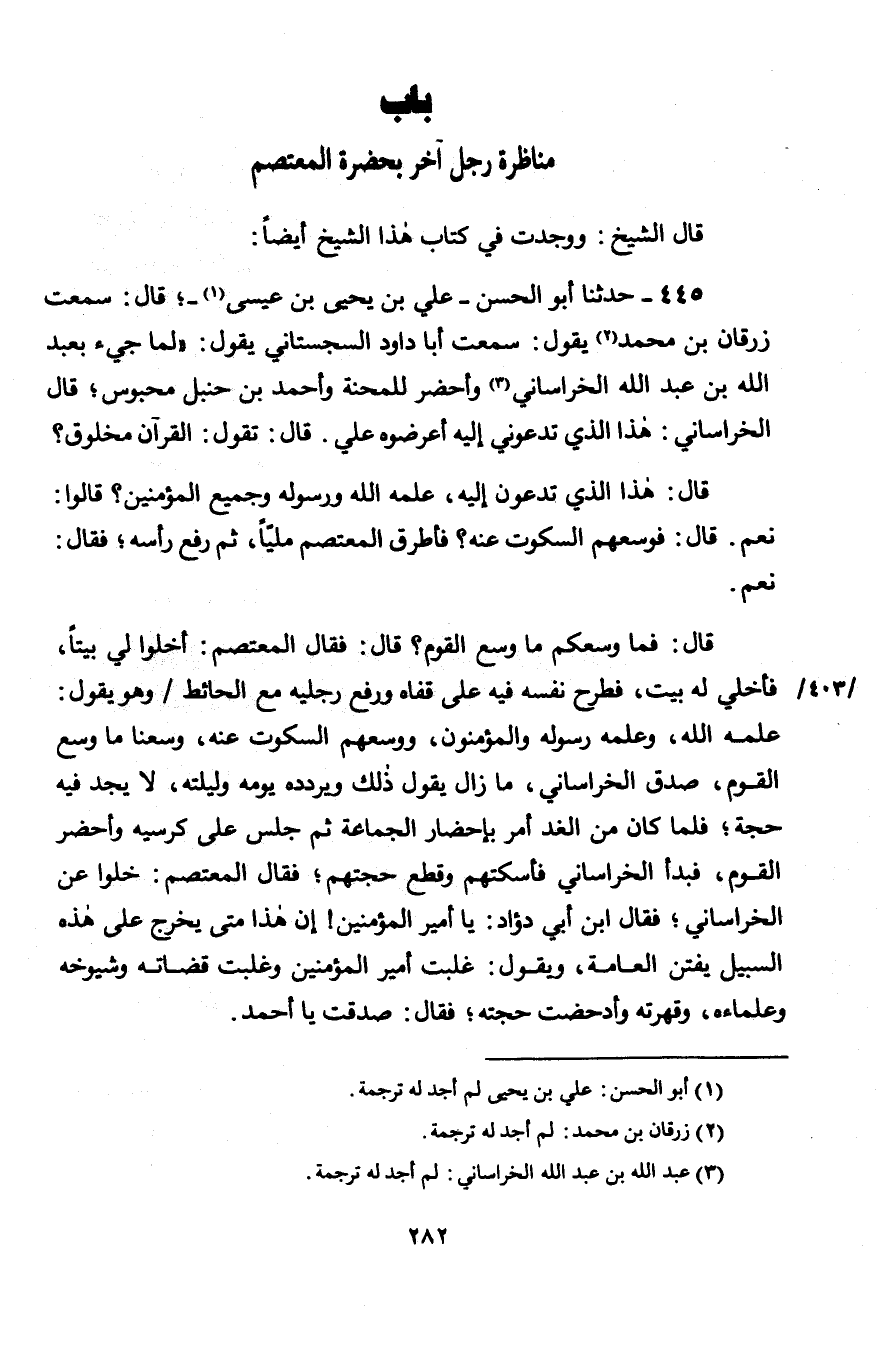 455 - قَالَ الشَّيْخُ: وَوَجَدْتُ فِي كِتَابِ هَذَا الشَّيْخِ أَيْضًا: حَدَّثَنَا أَبُو الْحَسَنِ عَلِيُّ بْنُ يَحْيَى بْنِ عِيسَى، قَالَ: سَمِعْتُ زُرْقَانَ بْنَ مُحَمَّدٍ، يَقُولُ: سَمِعْتُ أَبَا دَاوُدَ السِّجِسْتَانِيَّ، يَقُولُ: لَمَّا جِيءَ بِعَبْدِ اللَّهِ بْنِ عَبْدِ اللَّهِ الْخُرَاسَانِيِّ وَأُحْضِرَ لِلْمِحْنَةِ وَأَحْمَدُ بْنُ حَنْبَلٍ مَحْبُوسٌ قَالَ: الْخُرَاسَانِيُّ: هَذَا الَّذِي تَدْعُونِي إِلَيْهِ أَعْرِضُوهُ عَلَيَّ، قَالَ: تَقُولُ: الْقُرْآنُ مَخْلُوقٌ؟ قَالَ: §هَذَا الَّذِي تَدْعُونُ إِلَيْهِ عَلِمَهُ اللَّهُ وَرَسُولُهُ وَجَمِيعُ الْمُؤْمِنِينَ؟ قَالُوا: نَعَمْ. قَالَ: فَوَسِعَهُمُ السُّكُوتُ عَنْهُ؟ فَأَطْرَقَ الْمُعْتَصِمُ مَلِيًّا، ثُمَّ رَفَعَ رَأْسَهُ، فَقَالَ: نَعَمْ قَالَ: فَمَا وَسِعَكُمْ مَا وَسِعَ الْقَوْمَ؟ قَالَ: فَقَالَ الْمُعْتَصِمُ: أَخْلُوا لِي بَيْتًا، فَأُخْلِيَ لَهُ بَيْتٌ، فَطَرَحَ نَفْسَهُ فِيهِ عَلَى قَفَاهُ وَرَفَعَ رِجْلَيْهِ مَعَ الْحَائِطِ، وَهُوَ يَقُولُ: عَلِمَهُ اللَّهُ وَعَلِمَهُ رَسُولُهُ وَالْمُؤْمِنُونُ، وَوَسِعَهُمُ السُّكُوتُ عَنْهُ وَسِعَنَا مَا وَسِعَ الْقَوْمَ، صَدَقَ الْخُرَاسَانِيُّ، مَا زَالَ يَقُولُ ذَلِكَ وَيُرَدِّدُهُ يَوْمَهُ وَلَيْلَتَهُ، لَا يَجِدُ فِيهِ حُجَّةً، فَلَمَّا كَانَ مِنَ الْغَدِ أَمَرَ بِإِحْضَارِ الْجَمَاعَةِ ثُمَّ جَلَسَ عَلَى كُرْسِيِّهِ وَأَحْضَرَ الْقَوْمَ، فَبَدَأَ الْخُرَاسَانِيُّ فَأَسْكَتَهُمْ وَقَطَعَ حُجَّتَهُمْ، فَقَالَ الْمُعْتَصِمُ: خَلُّوا عَنِ الْخُرَاسَانِيِّ، فَقَالَ ابْنُ أَبِي دُؤَادٍ: يَا أَمِيرَ الْمُؤْمِنِينَ إِنَّ هَذَا مَتَى يَخْرُجُ عَلَى هَذِهِ السَّبِيلِ يَفْتِنُ الْعَامَّةَ وَيَقُولُ: غَلَبْتُ أَمِيرَ الْمُؤْمِنِينَ وَغَلَبْتُ قُضَاتَهُ وَشُيُوخَهُ وَعُلَمَاءَهُ، وَقَهَرْتُهُ وَأَدْحَضْتُ حُجَّتَهُ، فَقَالَ: صَدَقْتَ يَا أَحْمَدُ، -[283]- ثُمَّ قَالَ: جُرُّوا بِرِجْلِهِ، فَجَرُّوا بِرِجْلِهِ عَلَى وَجْهِهِ إِلَى الْبَيْتِ الَّذِي فِيهِ أَحْمَدُ بْنُ حَنْبَلٍ، فَتَعَلَّقَتِ الرَّزَّةُ بِغَلْصَمَتِهِ، فَقَالَ: اجْذِبُوهُ فَجَذَبُوهُ فَانْقَطَعَ رَأْسُهُ، قَالَ أَحْمَدُ بْنُ حَنْبَلٍ: فَسَمِعْتُ اللِّسَانَ يَقُولُ فِي الرَّأْسِ: غَيْرُ مَخْلُوقٍ ثَلَاثَ مَرَّاتٍ، ثُمَّ سَكَتَ قَالَ أَحْمَدُ: فَكَانَ ذَلِكَ مِمَّا بَصَّرَنِي فِي أَمْرِي، وَشُجِّعَ بِهِ قَلْبِي "