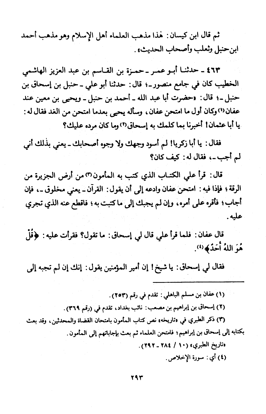 463 - حَدَّثَنَا أَبُو عُمَرَ حَمْزَةُ بْنُ الْقَاسِمِ بْنِ عَبْدِ الْعَزِيزِ الْهَاشِمِيُّ الْخَطِيبُ، كَانَ فِي جَامِعِ مَنْصُورٍ قَالَ: حَدَّثَنَا أَبُو عَلِيٍّ حَنْبَلُ بْنُ إِسْحَاقَ بْنِ حَنْبَلٍ، قَالَ: حَضَرْتُ أَبَا عَبْدِ اللَّهِ أَحْمَدَ بْنَ حَنْبَلٍ، وَيَحْيَى بْنَ مَعِينٍ عِنْدَ عَفَّانَ وَكَانَ أَوَّلَ مَا امْتُحِنَ عَفَّانُ، وَسَأَلَهُ يَحْيَى بَعْدَمَا امْتُحِنَ مِنَ الْغَدِ فَقَالَ لَهُ: يَا أَبَا عُثْمَانَ أَخْبِرْنَا بِمَا كَلَّمَكَ بِهِ إِسْحَاقُ وَمَا كَانَ مَرَّدَهُ عَلَيْكَ؟ فَقَالَ: «§يَا أَبَا زَكَرِيَّا لَمْ أُسَوِّدْ وَجْهَكَ وَلَا وُجُوهَ أَصْحَابِكَ، يَعْنِي بِذَلِكَ أَنِّي لَمْ أُجِبْ»، فَقَالَ لَهُ: كَيْفَ كَانَ؟ قَالَ: " قَرَأَ عَلَيَّ الْكِتَابَ الَّذِي كَتَبَ بِهِ الْمَأْمُونُ مِنْ أَرْضِ الْجَزِيرَةِ مِنَ الرَّقَةِ، فَإِذَا فِيهِ: امْتَحِنْ عَفَّانَ وَادْعُهُ إِلَى أَنْ يَقُولَ: الْقُرْآنُ - يَعْنِي: مَخْلُوقٌ - فَإِنْ أَجَابَ فَأَقِرَّهُ عَلَى أَمْرِهِ، وَإِنْ لَمْ يُجِبْكَ إِلَى مَا كَتَبْتُ بِهِ، فَاقْطَعْ عَنْهُ الَّذِي تُجْرِي عَلَيْهِ " قَالَ عَفَّانُ: " فَلَمَّا قَرَأَ عَلَيَّ، قَالَ لِي إِسْحَاقُ: مَا تَقُولُ؟ فَقَرَأْتُ عَلَيْهِ {قُلْ هُوَ اللَّهُ أَحَدٌ} [الإخلاص: 1] " فَقَالَ لِي إِسْحَاقُ: يَا شَيْخُ إِنَّ أَمِيرَ الْمُؤْمِنِينَ يَقُولُ: إِنَّكَ إِنْ لَمْ تُجِبْهُ إِلَى -[294]- مَا يَدْعُوكَ إِلَيْهِ يَقْطَعْ عَنْكَ مَا يُجْرِي عَلَيْكَ، وَإِنْ قَطَعَ عَنْكَ أَمِيرُ الْمُؤْمِنِينَ قَطَعْنَا نَحْنُ أَيْضًا، فَقَالَ: قَالَ عَفَّانُ: فَقُلْتُ لَهُ: فَقَوْلُ اللَّهِ عَزَّ وَجَلَّ {وَفِي السَّمَاءِ رِزْقُكُمْ وَمَا تُوعَدُونَ} [الذاريات: 22] قَالَ: فَسَكَتَ عَنِّي وَانْصَرَفْتُ، فَسُرَّ أَبُو عَبْدِ اللَّهِ بِذَلِكَ وَيَحْيَى وَأَصْحَابُهُمْ " قَالَ حَنْبَلٌ: فَسَمِعْتُ أَبَا عَبْدِ اللَّهِ بَعْدَ ذَلِكَ يَقُولُ: " سُبْحَانَ اللَّهِ كَانَ النَّاسُ يَتَكَلَّمُونَ يَعْنِي: فِي هَذَيْنِ الشَّيْخَيْنِ وَيَذْكُرُونَهُمَا، وَكُنَّا مِنَ النَّاسِ فِي أَمْرِهِمَا مَا اللَّهُ بِهِ عَلِيمٌ، قَامَا لِلَّهِ بِأَمْرٍ لَمْ يَقُمْ بِهِ أَحَدٌ مِثْلُ مَا قَامَا بِهِ عَفَّانُ وَأَبُو نُعَيْمٍ