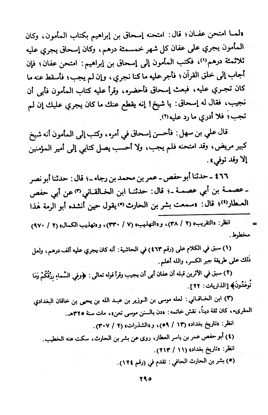 466 - حَدَّثَنَا أَبُو حَفْصٍ عُمَرُ بْنُ مُحَمَّدِ بْنِ رَجَاءٍ، قَالَ: حَدَّثَنَا أَبُو نَصْرٍ عِصْمَةُ بْنُ أَبِي عِصْمَةَ، قَالَ: حَدَّثَنَا ابْنُ الْخَالَقَانِيُّ، عَنْ أَبِي حَفْصٍ الْعَطَّارُ، قَالَ: سَمِعْتُ بِشْرَ بْنَ الْحَارِثِ، يَقُولُ حِينَ أَنْشَدَهُ أَبُو الرُّمَّةِ هَذَا -[296]- الشِّعْرَ فِي بِشْرٍ الْمِرِّيسِيِّ: «اكْتُبُوا هَذَا الشِّعْرَ وَتَعَلَّمُوهُ فَهُوَ أَنْفَعُ لَكُمْ مِنْ غَيْرِهِ، وَعَلِّمُوهُ صِبْيَانَكُمْ، وَرَأَيْتُ بِشْرًا يُعْجِبُهُ هَذَا الشِّعْرُ إِذَا أُنْشِدَهُ»: