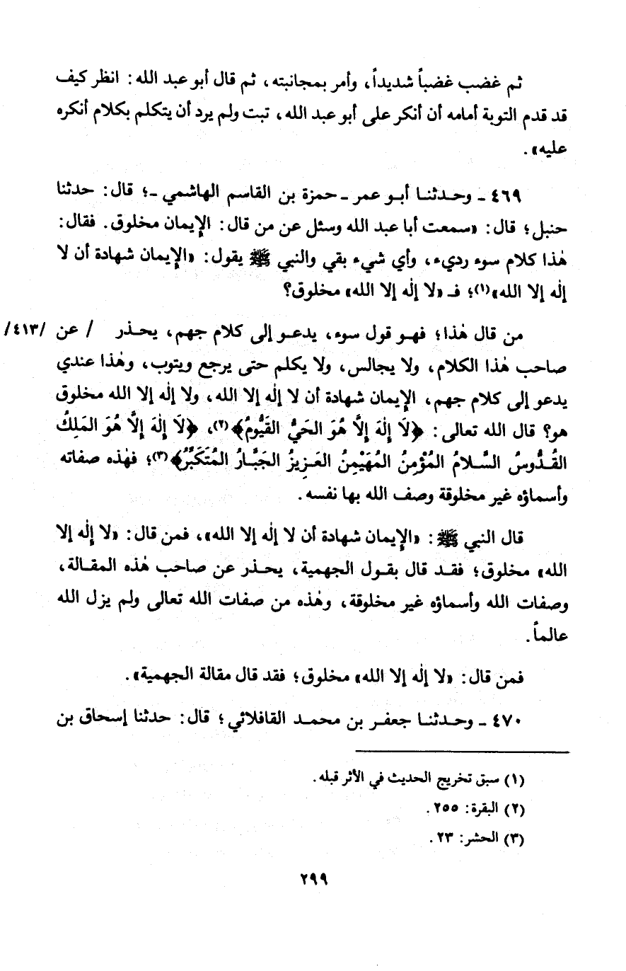 469 - وَحَدَّثَنَا أَبُو عُمَرَ حَمْزَةُ بْنُ الْقَاسِمِ الْهَاشِمِيُّ، قَالَ: حَدَّثَنَا حَنْبَلٌ، قَالَ: سَمِعْتُ أَبَا عَبْدِ اللَّهِ، وَسُئِلَ عَنْ §مَنْ قَالَ: الْإِيمَانُ مَخْلُوقٌ فَقَالَ: هَذَا كَلَامُ سُوءٍ رَدِيءٌ، وَأَيُّ شَيْءٍ بَقِيَ وَالنَّبِيُّ صَلَّى اللَّهُ عَلَيْهِ وَسَلَّمَ يَقُولُ: «الْإِيمَانُ شَهَادَةُ أَنْ لَا إِلَهَ إِلَّا اللَّهُ»، فَلَا إِلَهَ إِلَّا اللَّهُ " مَخْلُوقٌ؟ مَنْ قَالَ هَذَا، فَهُوَ قَوْلُ سُوءٍ، يُدْعَوْ إِلَى كَلَامِ جَهْمٍ، يُحَذَّرُ عَنْ صَاحِبِ هَذَا الْكَلَامِ، وَلَا يُجَالَسُ، وَلَا يُكَلَّمُ حَتَّى يَرْجِعَ وَيَتُوبَ، وَهَذَا عِنْدِي يَدْعُو إِلَى كَلَامِ جَهْمٍ، الْإِيمَانُ شَهَادَةُ أَنْ لَا إِلَهَ إِلَّا اللَّهُ، وَلَا إِلَهَ إِلَّا اللَّهُ مَخْلُوقٌ هُوَ؟ قَالَ اللَّهُ تَعَالَى {لَا إِلَهَ إِلَّا هُوَ الْحَيُّ الْقَيُّومُ} [البقرة: 255]، {لَا إِلَهَ إِلَّا هُوَ الْمَلِكُ الْقُدُّوسُ السَّلَامُ الْمُؤْمِنُ الْمُهَيْمِنُ الْعَزِيزُ الْجَبَّارُ الْمُتَكَبِّرُ} [الحشر: 23]، فَهَذِهِ صِفَاتُهُ وَأَسْمَاؤُهُ غَيْرُ مَخْلُوقَةٍ وَصَفَ اللَّهُ بِهَا نَفْسَهُ، قَالَ النَّبِيُّ صَلَّى اللَّهُ عَلَيْهِ وَسَلَّمَ: «الْإِيمَانُ شَهَادَةُ أَنْ لَا إِلَهَ إِلَّا اللَّهُ» فَمَنْ قَالَ: لَا إِلَهَ إِلَّا اللَّهُ مَخْلُوقٌ، فَقَدْ قَالَ بِقَوْلِ الْجَهْمِيَّةِ، يُحَذَّرُ عَنْ صَاحِبِ هَذِهِ الْمَقَالَةِ، وَصِفَاتُ اللَّهِ وَأَسْمَاؤُهُ غَيْرُ مَخْلُوقَةٍ، وَهَذِهِ مِنْ صِفَاتِ اللَّهِ تَعَالَى، وَلَمْ يَزَلِ اللَّهُ عَالِمًا، فَمَنْ قَالَ: لَا إِلَهَ إِلَّا اللَّهُ مَخْلُوقٌ فَقَدْ قَالَ مَقَالَةَ الْجَهْمِيَّةِ "