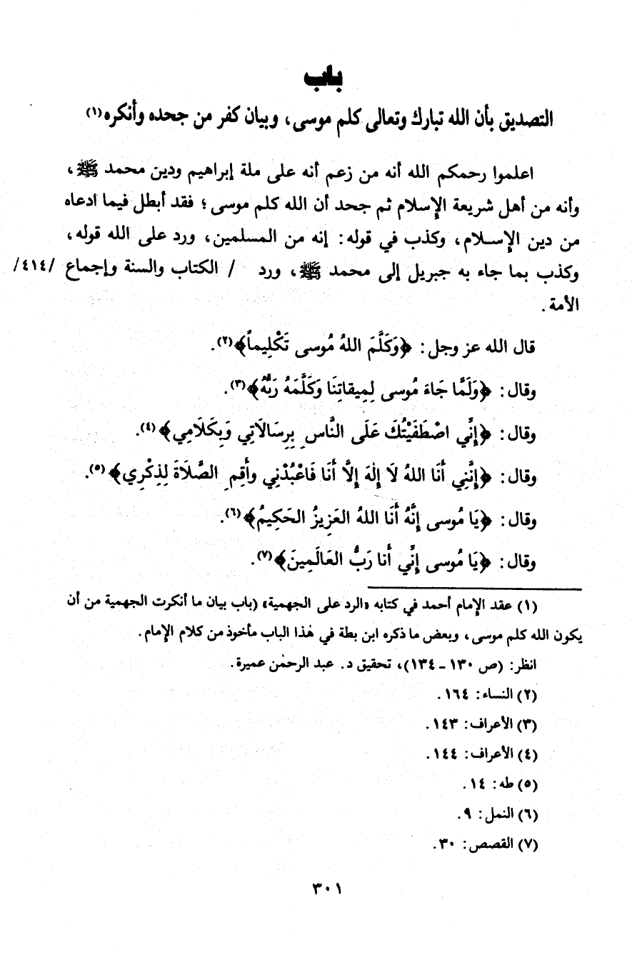 §بَابُ التَّصْدِيقِ بِأَنَّ اللَّهَ تَبَارَكَ وَتَعَالَى كَلَّمَ مُوسَى، وَبَيَانِ كُفْرِ مَنْ جَحَدَهُ وَأَنْكَرَهُ اعْلَمُوا رَحِمَكُمُ اللَّهُ أَنَّهُ مَنْ زَعَمَ أَنَّهُ عَلَى مِلَّةِ إِبْرَاهِيمَ وَدِينِ مُحَمَّدٍ صَلَّى اللَّهُ عَلَيْهِ وَسَلَّمَ وَأَنَّهُ مِنْ أَهْلِ شَرِيعَةِ الْإِسْلَامِ ثُمَّ جَحَدَ أَنَّ اللَّهَ كَلَّمَ مُوسَى، فَقَدْ أَبْطَلَ فِيمَا ادَّعَاهُ مِنْ دِينِ الْإِسْلَامِ، وَكَذَبَ فِي قَوْلِهِ: إِنَّهُ مِنَ الْمُسْلِمِينَ، وَرَدَّ عَلَى اللَّهِ قَوْلَهُ، وَكَذَّبَ بِمَا جَاءَ بِهِ جِبْرِيلُ إِلَى مُحَمَّدٍ صَلَّى اللَّهُ عَلَيْهِ وَسَلَّمَ، وَرَدَّ الْكِتَابَ وَالسُّنَّةَ وَإِجْمَاعَ الْأُمَّةِ، قَالَ اللَّهُ عَزَّ وَجَلَّ {وَكَلَّمَ اللَّهُ مُوسَى تَكْلِيمًا} [النساء: 164]، وَقَالَ {وَلَمَّا جَاءَ مُوسَى لِمِيقَاتِنَا وَكَلَّمَهُ رَبُّهُ} [الأعراف: 143]، وَقَالَ {إِنِّي اصْطَفَيْتُكَ عَلَى النَّاسِ بِرِسَالَاتِي وَبِكَلَامِي} [الأعراف: 144]، وَقَالَ {إِنَّنِي أَنَا اللَّهُ لَا إِلَهَ إِلَّا أَنَا فَاعْبُدْنِي وَأَقِمِ الصَّلَاةَ لِذِكْرِي} [طه: 14]، وَقَالَ {يَا مُوسَى إِنَّهُ أَنَا اللَّهُ الْعَزِيزُ الْحَكِيمُ} [النمل: 9]، وَقَالَ {يَا مُوسَى إِنِّي أَنَا اللَّهُ رَبُّ الْعَالَمِينَ} [القصص: 30]،