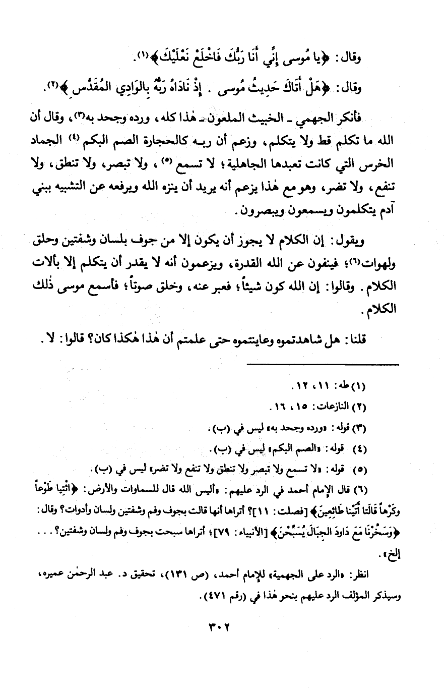 وَقَالَ {يَا مُوسَى إِنِّي أَنَا رَبُّكَ فَاخْلَعْ نَعْلَيْكَ} [طه: 12]، وَقَالَ {هَلْ أَتَاكَ حَدِيثُ مُوسَى إِذْ نَادَاهُ رَبُّهُ بِالْوَادِي الْمُقَدَّسِ} [النازعات: 15] فَأَنْكَرَ الْجَهْمِيُّ الْخَبِيثُ الْمَلْعُونُ هَذَا كُلَّهُ، وَرَدَّهُ وَجَحَدَ بِهِ، وَقَالَ: إِنَّ اللَّهَ مَا تَكَلَّمَ قَطُّ وَلَا يَتَكَلَّمُ، وَزَعَمَ أَنَّ رَبَّهُ كَالْحِجَارَةِ الصُّمِّ الْبُكْمِ الْجَمَادِ الْخُرْسِ الَّتِي كَانَتْ تَعْبُدُهَا الْجَاهِلِيَّةُ، لَا تَسْمَعُ، وَلَا تُبْصِرُ، وَلَا تَنْطِقُ، وَلَا تَنْفَعُ، وَلَا تَضُرُّ، وَهُوَ مَعَ هَذَا يَزْعُمُ أَنَّهُ يُرِيدُ أَنْ يُنَزِّهَ اللَّهَ وَيَرْفَعَهُ عَنِ التَّشْبِيهِ بِبَنِي آدَمَ يَتَكَلَّمُونَ وَيَسْمَعُونَ وَيُبْصِرُونَ، وَيَقُولُ: إِنَّ الْكَلَامَ لَا يَجُوزُ أَنْ يَكُونَ إِلَّا مِنْ جَوْفٍ بِلِسَانٍ وَشَفَتَيْنِ وَحَلْقٍ وَلَهَوَاتً، فَيَنْفُونَ عَنِ اللَّهِ الْقُدْرَةَ، وَيَزْعُمُونَ أَنَّهُ لَا يَقْدِرُ أَنْ يَتَكَلَّمَ إِلَّا بِآلَاتِ الْكَلَامِ، وَقَالُوا: إِنَّ اللَّهَ كَوَّنَ شَيْئًا فَعَبَّرَ عَنْهُ، وَخَلَقَ صَوْتًا، فَأَسْمَعَ مُوسَى ذَلِكَ الْكَلَامَ، قُلْنَا: هَلْ شَاهَدْتُمُوهُ وَعَايَنْتِمُوُهُ حَتَّى عَلِمْتُمْ أَنَّ هَذَا هَكَذَا كَانَ؟ قَالُوا: لَا،