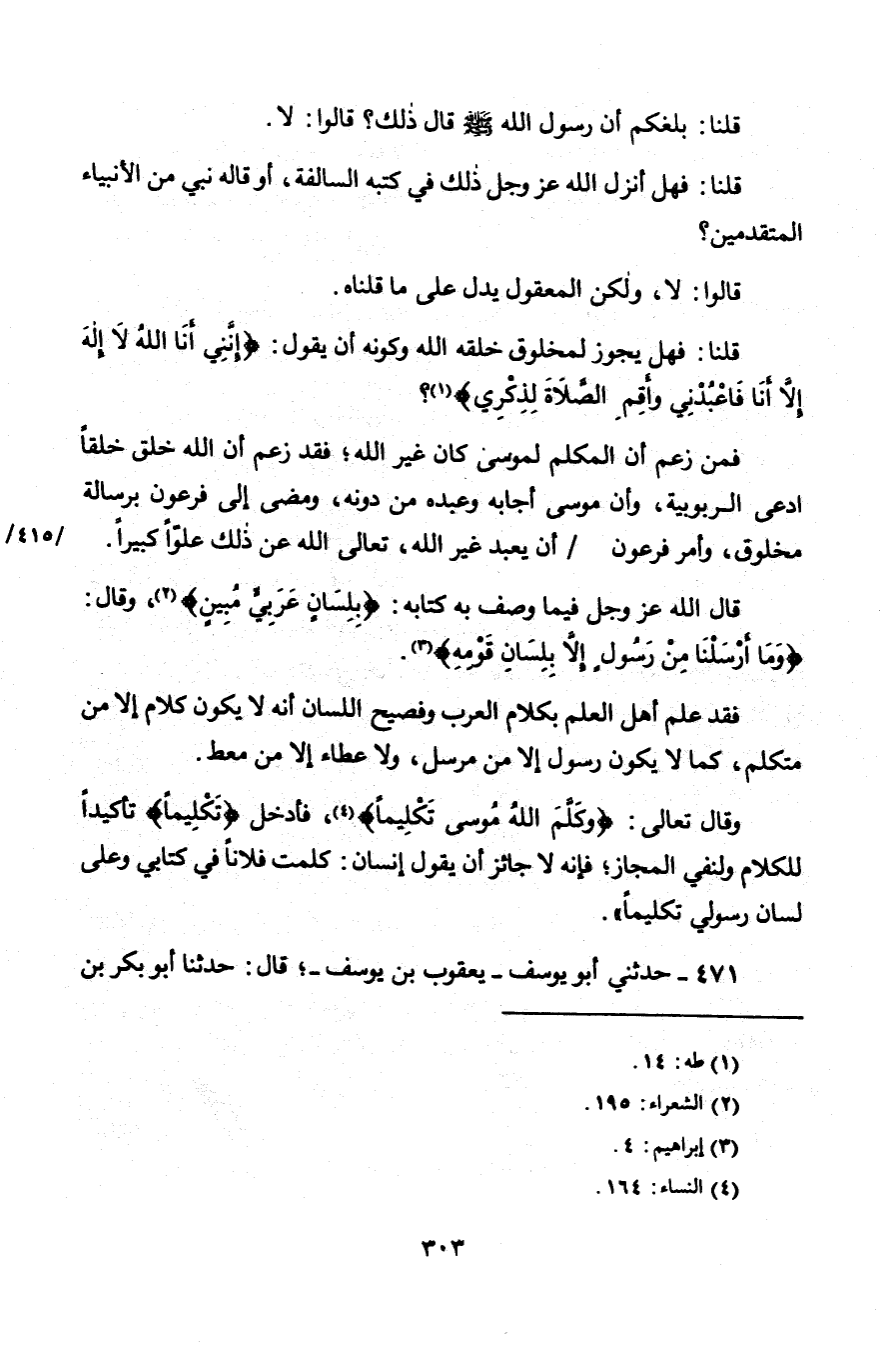 قُلْنَا: بَلَغَكُمْ أَنَّ رَسُولَ اللَّهِ صَلَّى اللَّهُ عَلَيْهِ وَسَلَّمَ قَالَ ذَلِكَ؟ قَالُوا: لَا. قُلْنَا: فَهَلْ أَنْزَلَ اللَّهُ عَزَّ وَجَلَّ ذَلِكَ فِي كُتُبِهِ السَّالِفَةِ، أَوْ قَالَهُ نَبِيٌّ مِنَ الْأَنْبِيَاءِ الْمُتَقَدِّمِينَ؟ قَالُوا: لَا، وَلَكِنَّ الْمَعْقُولَ يَدُلُّ عَلَى مَا قُلْنَاهُ، قُلْنَا: فَهَلْ يَجُوزُ لِمَخْلُوقٍ خَلَقَهُ اللَّهُ وَكَوَّنَهُ أَنْ يَقُولَ {إِنَّنِي أَنَا اللَّهُ لَا إِلَهَ إِلَّا أَنَا فَاعْبُدْنِي وَأَقِمِ الصَّلَاةَ لِذِكْرِي} [طه: 14]؟ فَمَنْ زَعَمَ أَنَّ الْمُكَلِّمَ لِمُوسَى كَانَ غَيْرَ اللَّهِ، فَقَدْ زَعَمَ أَنَّ اللَّهَ خَلَقَ خَلْقًا ادَّعَى الرُّبُوبِيَّةَ، وَأَنَّ مُوسَى أَجَابَهُ وَعَبَدَهُ مِنْ دُونِهِ، وَمَضَى إِلَى فِرْعَوْنَ بِرِسَالَةِ مَخْلُوقٍ، وَأَمَرَ فِرْعَوْنَ أَنْ يَعْبُدَ غَيْرَ اللَّهِ، تَعَالَى اللَّهُ عَنْ ذَلِكَ عُلُوًّا كَبِيرًا، قَالَ اللَّهُ عَزَّ وَجَلَّ فِيمَا وَصَفَ بِهِ كِتَابَهُ {بِلِسَانٍ عَرَبِيٍّ مُبِينٍ} [الشعراء: 195]، وَقَالَ {وَمَا أَرْسَلْنَا مِنْ رَسُولٍ إِلَّا بِلِسَانِ قَوْمِهِ} [إبراهيم: 4] فَقَدْ عَلِمَ أَهْلُ الْعِلْمِ بِكَلَامِ الْعَرَبِ وَفَصِيحِ اللِّسَانِ أَنَّهُ لَا يَكُونُ كَلَامٌ إِلَّا مِنْ مُتَكَلِّمٍ، كَمَا لَا يَكُونُ رَسُولٌ إِلَّا مِنْ مُرْسَلٍ، وَلَا عَطَاءٌ إِلَّا مِنْ مُعْطٍ وَقَالَ تَعَالَى {وَكَلَّمَ اللَّهُ مُوسَى تَكْلِيمًا} [النساء: 164]، فَأَدْخَلَ {تَكْلِيمًا} [النساء: 164] تَأْكِيدًا لِلْكَلَامِ وَلِنَفْيِ الْمَجَازِ، فَإِنَّهُ لَا جَائِزَ أَنْ يَقُولَ إِنْسَانٌ: كَلَّمْتُ فُلَانًا فِي كِتَابِي وَعَلَى لِسَانِ رَسُولِي تَكْلِيمًا