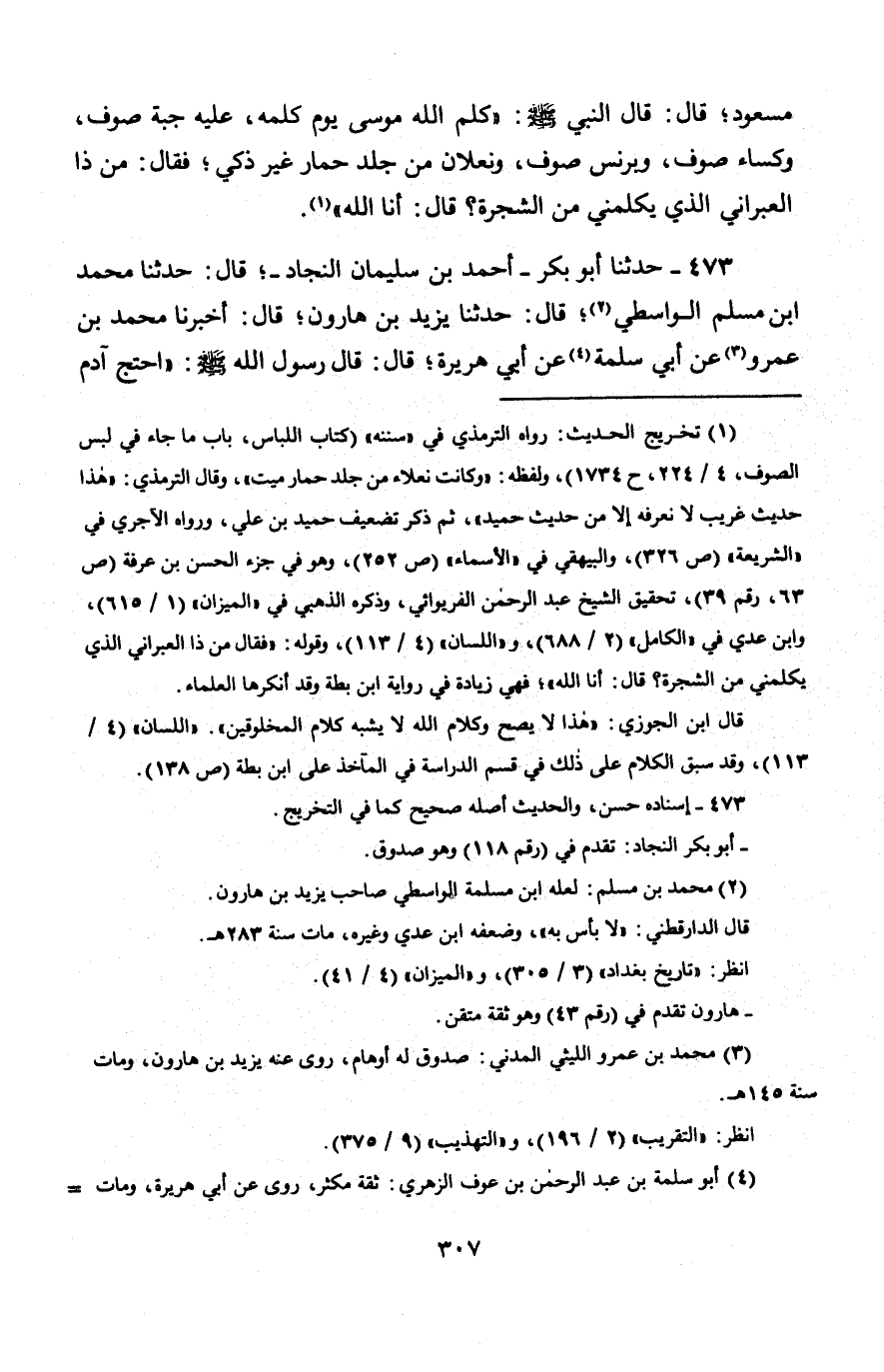473 - حَدَّثَنَا أَبُو بَكْرٍ أَحْمَدُ بْنُ سُلَيْمَانَ النِّجَادُ، قَالَ: حَدَّثَنَا مُحَمَّدُ بْنُ مُسْلِمٍ الْوَاسِطِيُّ، قَالَ: حَدَّثَنَا يَزِيدُ بْنُ هَارُونَ، قَالَ: أَخْبَرَنَا مُحَمَّدُ بْنُ عَمْرٍو، عَنْ أَبِي سَلَمَةَ، عَنْ أَبِي هُرَيْرَةَ، قَالَ: قَالَ رَسُولُ اللَّهِ صَلَّى اللَّهُ عَلَيْهِ وَسَلَّمَ: " §احْتَجَّ آدَمُ -[308]- وَمُوسَى عَلَيْهِمَا السَّلَامُ، فَقَالَ مُوسَى: أَنْتَ الَّذِي خَلَقَكَ اللَّهُ بِيَدِهِ وَنَفَخَ فِيكَ مِنْ رُوحِهِ، وَأَمَرَ الْمَلَائِكَةَ فَسَجَدُوا لَكَ، وَأَسْكَنَكَ الْجَنَّةَ، فَأَخْرَجْتَنَا مِنْهَا. فَقَالَ آدَمُ: أَنْتَ مُوسَى الَّذِي اصْطَفَاكَ اللَّهُ بِرِسَالَتِهِ، وَقَرَّبَكَ نَجِيًّا، وَكَلَّمَكَ تَكْلِيمًا، وَأَنْزَلَ عَلَيْكَ التَّوْرَاةَ " وَذَكَرَ الْحَدِيثَ بِتَمَامِهِ