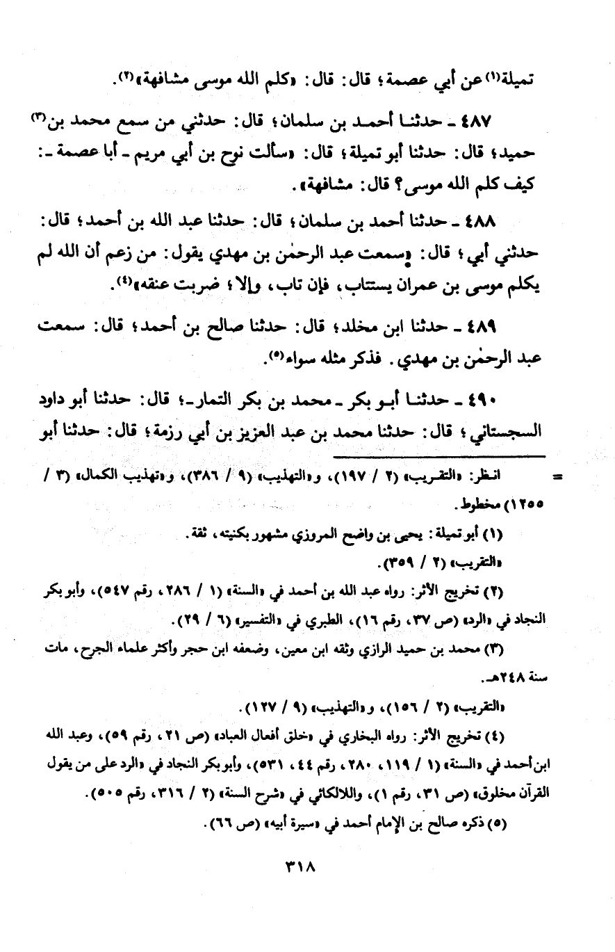 488 - حَدَّثَنَا أَحْمَدُ بْنُ سَلْمَانَ، قَالَ: حَدَّثَنَا عَبْدُ اللَّهِ بْنُ أَحْمَدَ، قَالَ: حَدَّثَنِي أَبِي قَالَ: سَمِعْتُ عَبْدَ الرَّحْمَنِ بْنَ مَهْدِيٍّ، يَقُولُ: § «مَنْ زَعَمَ أَنَّ اللَّهَ لَمْ يُكَلِّمْ مُوسَى بْنَ عِمْرَانَ يُسْتَتَابُ، فَإِنْ تَابَ، وَإِلَّا ضُرِبَتْ عُنُقُهُ»