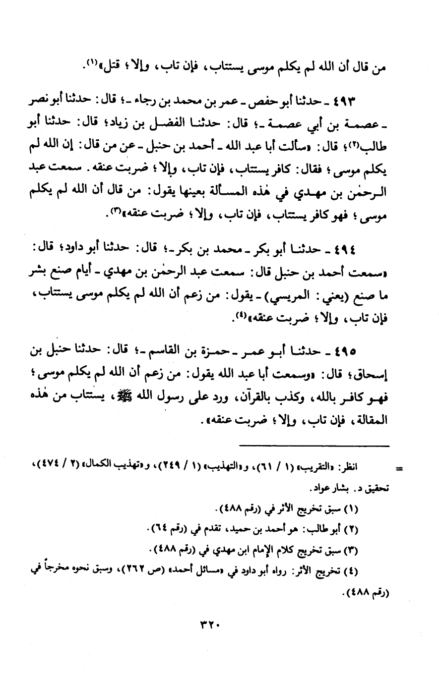 493 - حَدَّثَنَا أَبُو حَفْصٍ عُمَرُ بْنُ مُحَمَّدِ بْنِ رَجَاءٍ، قَالَ: حَدَّثَنَا أَبُو نَصْرٍ عِصْمَةُ بْنُ أَبِي عِصْمَةَ قَالَ: حَدَّثَنَا الْفَضْلُ بْنُ زِيَادٍ قَالَ: حَدَّثَنَا أَبُو طَالِبٍ، قَالَ: سَأَلْتُ أَبَا عَبْدِ اللَّهِ أَحْمَدَ بْنَ حَنْبَلٍ، عَنْ §مَنْ قَالَ: إِنَّ اللَّهَ لَمْ يُكَلِّمْ مُوسَى، فَقَالَ: «كَافِرٌ يُسْتَتَابُ، فَإِنْ تَابَ، وَإِلَّا ضُرِبَتْ عُنُقُهُ» سَمِعْتُ عَبْدَ الرَّحْمَنِ بْنَ مَهْدِيٍّ فِي هَذِهِ الْمَسْأَلَةِ بِعَيْنِهَا يَقُولُ: «مَنْ قَالَ إِنَّ اللَّهَ لَمْ يُكَلِّمْ مُوسَى، فَهُوَ كَافِرٌ يُسْتَتَابُ، فَإِنْ تَابَ، وَإِلَّا ضُرِبَتْ عُنُقُهُ»