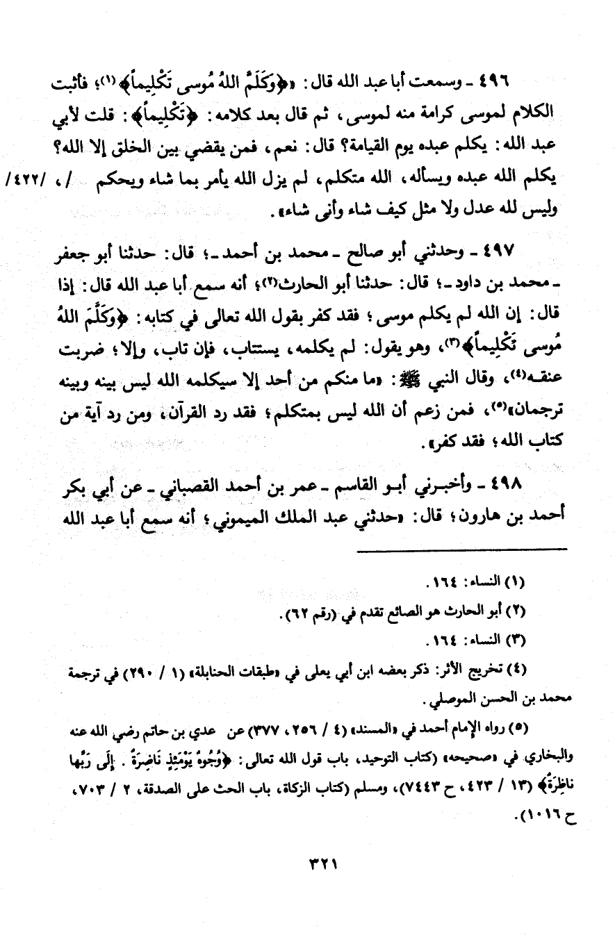 497 - وَحَدَّثَنِي أَبُو صَالِحٍ مُحَمَّدُ بْنُ أَحْمَدَ قَالَ: حَدَّثَنَا أَبُو جَعْفَرٍ مُحَمَّدُ بْنُ دَاوُدَ، قَالَ: حَدَّثَنَا أَبُو الْحَارِثِ، أَنَّهُ سَمِعَ أَبَا عَبْدِ اللَّهِ، قَالَ: " إِذَا قَالَ: إِنَّ اللَّهَ لَمْ يُكَلِّمْ مُوسَى، فَقَدْ كَفَرَ بِقَوْلِ اللَّهِ تَعَالَى فِي كِتَابِهِ {وَكَلَّمَ اللَّهُ مُوسَى تَكْلِيمًا} [النساء: 164]، وَهُوَ يَقُولُ: لَمْ يُكَلِّمْهُ يُسْتَتَابُ فَإِنْ تَابَ، وَإِلَّا ضُرِبَتْ عُنُقُهُ، وَقَالَ النَّبِيُّ صَلَّى اللَّهُ عَلَيْهِ وَسَلَّمَ: § «مَا مِنْكُمْ مِنْ أَحَدٍ إِلَّا سَيُكَلِّمُهُ اللَّهُ لَيْسَ بَيْنَهُ وَبَيْنَهُ تُرْجُمَانُ»، فَمَنْ زَعَمَ أَنَّ اللَّهَ لَيْسَ بِمُتَكَلِّمٍ، فَقَدْ رَدَّ الْقُرْآنَ، وَمَنْ رَدَّ آيَةً مِنْ كِتَابِ اللَّهِ فَقَدْ كَفَرَ