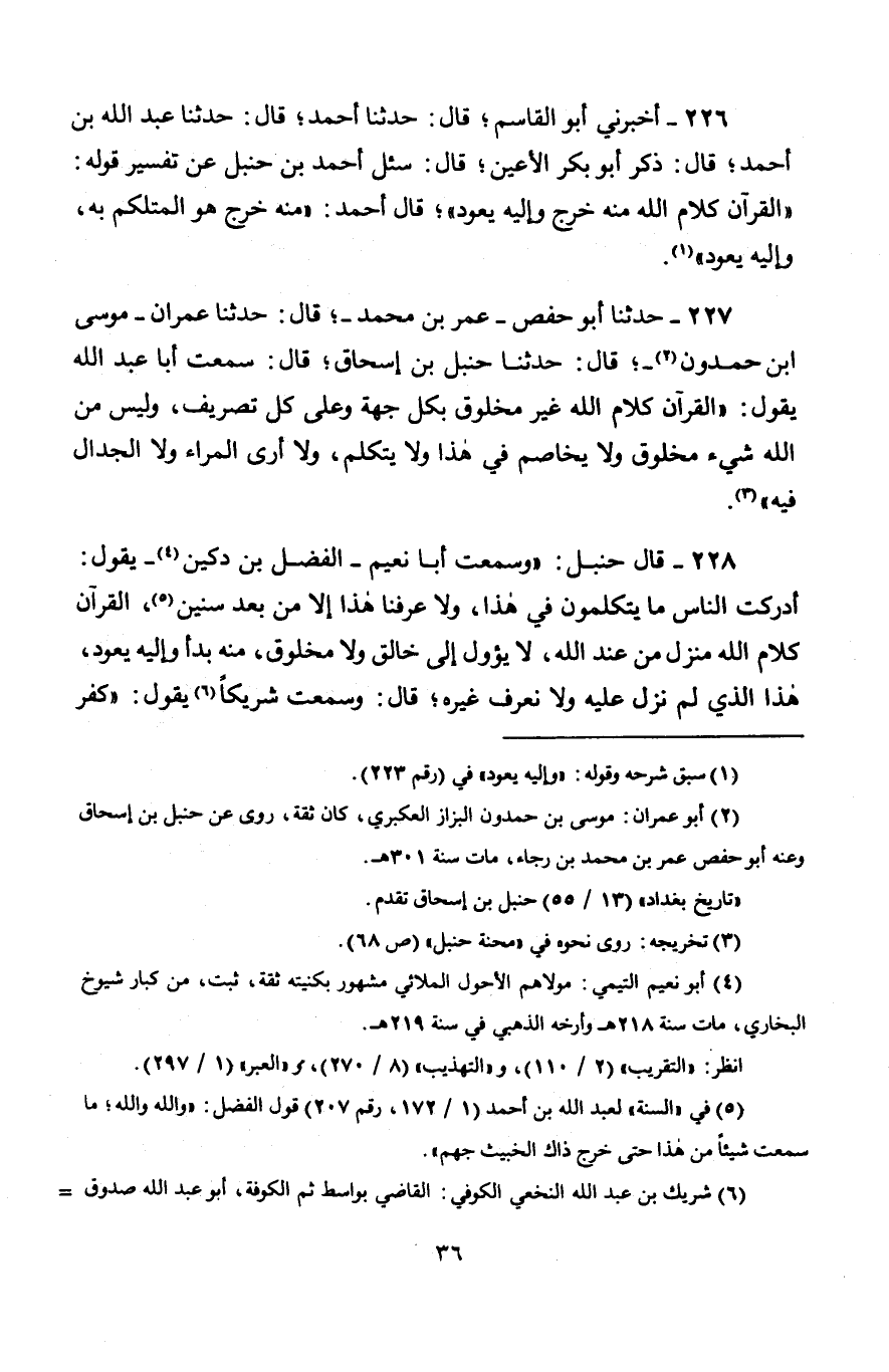 226 - أَخْبَرَنِي أَبُو الْقَاسِمِ، قَالَ: حَدَّثَنَا أَحْمَدُ، قَالَ: حَدَّثَنَا عَبْدُ اللَّهِ بْنُ أَحْمَدَ، قَالَ: ذَكَرَ أَبُو بَكْرٍ الْأَعْيُنُ قَالَ: سُئِلَ أَحْمَدُ بْنُ حَنْبَلٍ عَنْ تَفْسِيرِ قَوْلِهِ: §" الْقُرْآنُ كَلَامُ اللَّهِ مِنْهُ خَرَجَ وَإِلَيْهِ يَعُودُ؟ قَالَ أَحْمَدُ: «مِنْهُ خَرَجَ هُوَ الْمُتَكَلِّمُ بِهِ، وَإِلَيْهِ يَعُودُ»