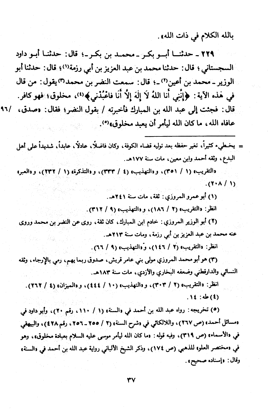 229 - حَدَّثَنَا أَبُو بَكْرٍ مُحَمَّدُ بْنُ بَكْرٍ، قَالَ: حَدَّثَنَا أَبُو دَاوُدَ السِّجِسْتَانِيُّ، قَالَ: حَدَّثَنَا مُحَمَّدُ بْنُ عَبْدِ الْعَزِيزِ بْنِ أَبِي رِزْمَةَ، قَالَ: حَدَّثَنَا أَبُو الْوَزِيرِ مُحَمَّدُ بْنُ أَعْيَنَ، قَالَ: سَمِعْتُ النَّضْرَ بْنَ مُحَمَّدٍ، يَقُولُ: " §مَنْ قَالَ فِي هَذِهِ الْآيَةِ {إِنَّنِي أَنَا اللَّهُ لَا إِلَهَ إِلَّا أَنَا فَاعْبُدْنِي} [طه: 14] مَخْلُوقٌ، فَهُوَ كَافِرٌ ". قَالَ: فَجِئْتُ إِلَى عَبْدِ اللَّهِ بْنِ الْمُبَارَكِ فَأَخْبَرْتُهُ بِقَوْلِ النَّضْرِ، فَقَالَ: صَدَقَ، عَافَاهُ اللَّهُ، مَا كَانَ اللَّهُ لِيَأْمُرَ أَنْ يُعْبَدَ مَخْلُوقٌ