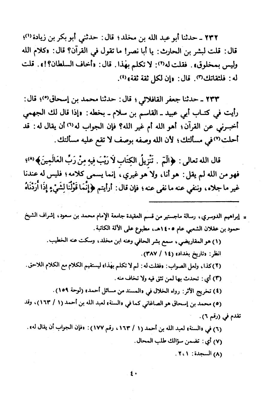 233 - حَدَّثَنَا جَعْفَرٌ الْقَافْلَائِي، قَالَ: حَدَّثَنَا مُحَمَّدُ بْنُ إِسْحَاقَ، قَالَ: رَأَيْتُ فِيَ كِتَابِ أَبِي عُبَيْدٍ الْقَاسِمِ بْنِ سَلَّامٍ بِخَطِّهِ: " إِذَا قَالَ لَكَ الْجَهْمِيُّ: أَخْبِرْنِي عَنِ الْقُرْآنِ، أَهُوَ اللَّهُ أَمْ غَيْرُ اللَّهِ؟ فَإِنَّ الْجَوَّابَ لَهُ أَنْ يُقَالَ لَهُ: " قَدْ أَحَلْتَ فِي مَسْأَلَتِكَ، لِأَنَّ اللَّهَ وَصَفَهُ بِوَصْفٍ لَا تَقَعُ عَلَيْهِ مَسْأَلَتُكَ، قَالَ اللَّهُ تَعَالَى: {الم تَنْزِيلُ الْكِتَابِ لَا رَيْبَ فِيهِ مِنْ رَبِّ الْعَالَمِينَ} [السجدة: 2] §فَهُوَ مِنَ اللَّهِ لَمْ يَقُلْ: هُوَ أَنَا، وَلَا هُوَ غَيْرِي، إِنَّمَا يُسَمَّى كَلَامَهُ، فَلَيْسَ لَهُ عِنْدَنَا غَيْرُ مَا جَلَّاهُ، وَنَنْفِي عَنْهُ مَا نَفَى عَنْهُ، فَإِنْ قَالَ: أَرَأَيْتُمْ {إِنَّمَا قَوْلُنَا لِشَيْءٍ إِذَا أَرَدْنَاهُ -[41]- أَنْ نَقُولَ لَهُ كُنْ فَيَكُونُ} [النحل: 40] فَأَخْبَرَهُ أَنَّ الْقُرْآنَ شَيْءٌ، فَهُوَ مَخْلُوقٌ قِيلَ لَهُ: لَيْسَ قَوْلُ اللَّهِ يُقَابَلُ بِهِ شَيْءٌ، أَلَا تَسْمَعُ كَلَامَهُ {إِنَّمَا قَوْلُنَا لِشَيْءٍ إِذَا أَرَدْنَاهُ} [النحل: 40]، فَأَخْبَرَهُ أَنَّ الْقُرْآنَ كَانَ مِنْهُ قَبْلَ الشَّيْءِ، فَالْقَوْلُ مِنَ اللَّهِ سَبَقَ الشَّيْءَ، وَمَعْنَى قَوْلُهُ {لِشَيْءٍ} [النحل: 40]، أَيْ: كَانَ فِي عِلْمِهِ أَنْ يَكُونَهُ "