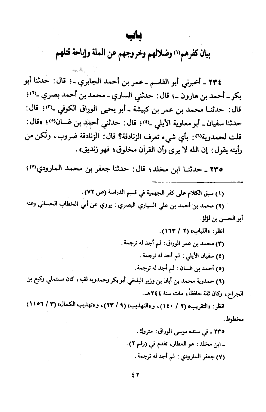 234 - أَخْبَرَنِي أَبُو الْقَاسِمِ عُمَرُ بْنُ أَحْمَدَ الْجَابِرِيُّ، قَالَ: حَدَّثَنَا أَبُو بَكْرٍ أَحْمَدُ بْنُ هَارُونَ قَالَ: حَدَّثَنِي السَّارِيُّ مُحَمَّدُ بْنُ أَحْمَدَ بَصَرِيٌّ، قَالَ: حَدَّثَنَا مُحَمَّدُ بْنُ عُمَرَ بْنِ كُبَيْشَةَ أَبُو يَحْيَى الْوَرَّاقُ الْكُوفِيُّ، قَالَ: حَدَّثَنَا سُفْيَانُ أَبُو مُعَاوِيَةَ الْأَيْلِيُّ، قَالَ: حَدَّثَنِي أَحْمَدُ بْنُ غَسَّانَ، قَالَ: قُلْتُ لِحَمْدَوَيْهِ: بِأَيِّ شَيْءٍ تَعْرِفُ الزَّنَادِقَةَ؟ قَالَ: " §الزَّنَادِقَةُ ضُرُوبٌ، وَلَكِنْ مَنْ رَأَيْتَهُ يَقُولُ: إِنَّ اللَّهَ لَا يَرَى وَأَنَّ الْقُرْآنَ مَخْلُوقٌ، فَهُوَ زِنْدِيقٌ "