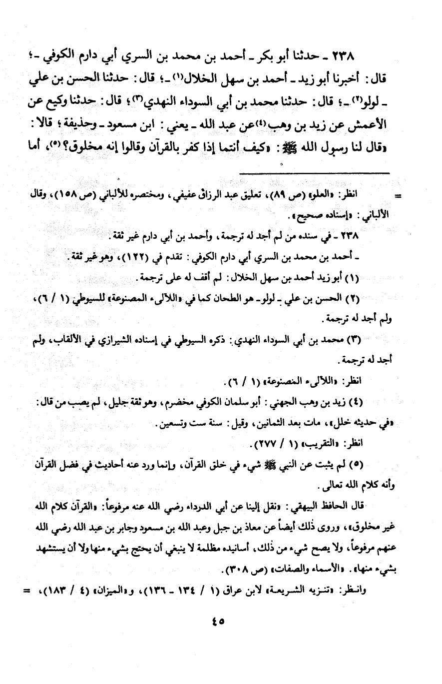 238 - حَدَّثَنَا أَبُو بَكْرٍ أَحْمَدُ بْنُ مُحَمَّدِ بْنِ السَّرِيِّ أَبِي دَارِمٍ الْكُوفِيُّ، قَالَ: أَخْبَرَنَا أَبُو زَيْدٍ أَحْمَدُ بْنُ سَهْلٍ الْخَلَّالُ، قَالَ: حَدَّثَنَا الْحَسَنُ بْنُ عَلِيٍّ لُولُو قَالَ: حَدَّثَنَا مُحَمَّدُ بْنُ أَبِي السَّوْدَاءِ النَّهْدِيُّ، قَالَ: حَدَّثَنَا وَكِيعٌ، عَنِ الْأَعْمَشِ، عَنْ زَيْدِ بْنِ وَهْبٍ، عَنْ عَبْدِ اللَّهِ يَعْنِي ابْنَ مَسْعُودٍ، وَحُذَيْفَةَ، قَالَا: قَالَ لَنَا رَسُولُ اللَّهِ صَلَّى اللَّهُ عَلَيْهِ وَسَلَّمَ: § «كَيْفَ أَنْتُمَا إِذَا كُفِرَ بِالْقُرْآنِ وَقَالُوا إِنَّهُ مَخْلُوقٌ؟ أَمَا -[46]- إِنَّكُمَا لَنْ تُدْرِكَا ذَلِكَ، وَلَكِنْ إِذَا كَانَ ذَلِكَ بَرِئَ اللَّهُ مِنْهُمْ وَجِبْرِيلُ وِصَالِحُ الْمُؤْمِنِينَ، وَكَفَرُوا بِمَا أُنْزِلَ عَلَيَّ»