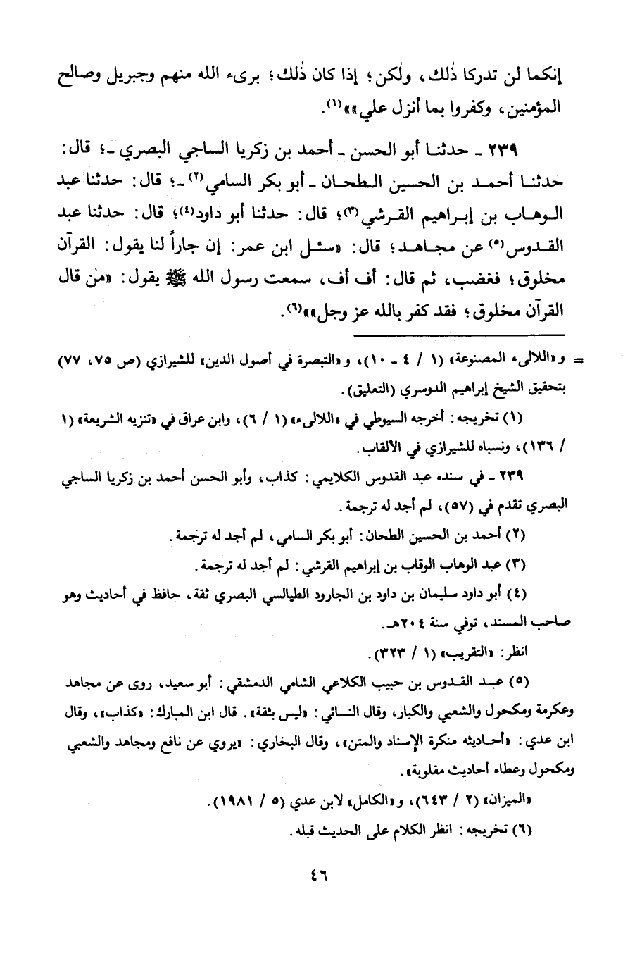 239 - حَدَّثَنَا أَبُو الْحَسَنِ أَحْمَدُ بْنُ زَكَرِيَّا السَّاجِيُّ الْبَصْرِيُّ قَالَ: حَدَّثَنَا أَحْمَدُ بْنُ الْحُسَيْنِ الطَّحَّانُ أَبُو بَكْرٍ السَّامِيُّ، قَالَ: حَدَّثَنَا عَبْدُ الْوَهَّابِ بْنُ إِبْرَاهِيمَ الْقُرَشِيُّ، قَالَ: حَدَّثَنَا أَبُو دَاوُدَ، قَالَ: حَدَّثَنَا عَبْدُ الْقُدُّوسِ، عَنْ مُجَاهِدٍ، قَالَ: سُئِلَ ابْنُ عُمَرَ إِنَّ جَارًا لَنَا يَقُولُ: الْقُرْآنُ مَخْلُوقٌ، فَغَضِبَ، ثُمَّ قَالَ: أُفٍّ أُفٍّ، سَمِعْتُ رَسُولَ اللَّهِ صَلَّى اللَّهُ عَلَيْهِ وَسَلَّمَ يَقُولُ: " §مَنْ قَالَ: الْقُرْآنُ مَخْلُوقٌ، فَقَدْ كَفَرَ بِاللَّهِ عَزَّ وَجَلَّ "