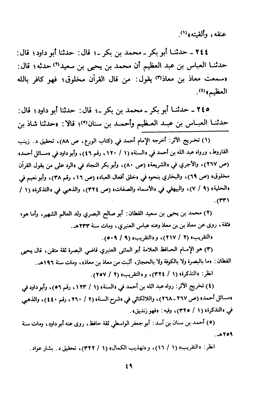 244 - حَدَّثَنَا أَبُو بَكْرٍ مُحَمَّدُ بْنُ بَكْرٍ، قَالَ: حَدَّثَنَا أَبُو دَاوُدَ، قَالَ: حَدَّثَنَا الْعَبَّاسُ بْنُ عَبْدِ الْعَظِيمِ، أَنَّ مُحَمَّدَ بْنَ يَحْيَى بْنِ سَعِيدٍ، حَدَّثَهُ قَالَ: سَمِعْتُ مُعَاذَ بْنَ مُعَاذٍ، يَقُولُ: § «مَنْ قَالَ الْقُرْآنُ مَخْلُوقٌ فَهُوَ كَافِرٌ بِاللَّهِ الْعَظِيمِ»