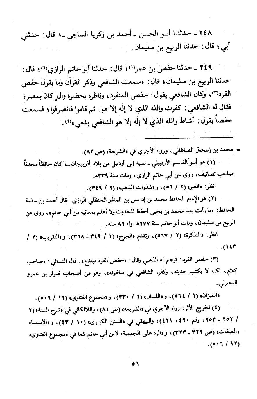 249 - حَدَّثَنَا حَفْصُ بْنُ عُمَرَ، قَالَ: حَدَّثَنَا أَبُو حَاتِمٍ الرَّازِيُّ، قَالَ: حَدَّثَنَا الرَّبِيعُ بْنُ سُلَيْمَانَ، قَالَ: سَمِعْتُ الشَّافِعِيَّ، وَذُكِرَ الْقُرْآنَ، وَمَا يَقُولُ حَفْصٌ الْفَرْدُ وَكَانَ الشَّافِعِيُّ يَقُولُ: حَفْصٌ الْمُنْفَرِدُ، وَنَاظَرَهُ بِحَضْرَةِ وَالٍ كَانَ بِمِصْرَ §فَقَالَ لَهُ الشَّافِعِيُّ: «كَفَرْتَ وَاللَّهِ الَّذِي لَا إِلَهَ إِلَّا هُوَ» ثُمَّ قَامُوا فَانْصَرَفُوا فَسَمِعْتُ حَفْصًا يَقُولُ: أَشَاطَ وَاللَّهِ الَّذِي لَا إِلَهَ إِلَّا هُوَ الشَّافِعِيُّ بِدَمِي