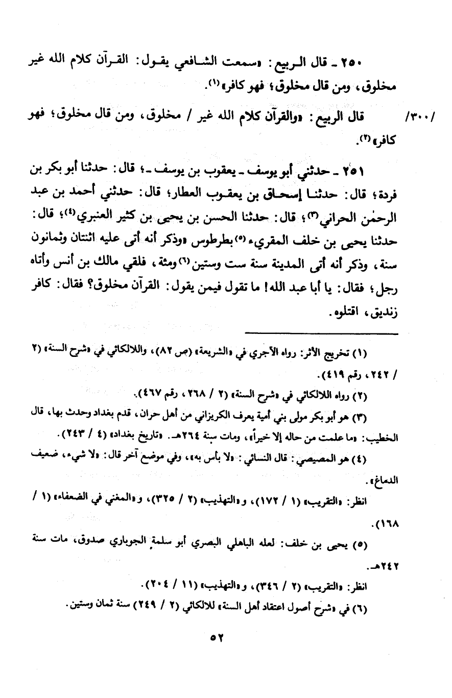251 - حَدَّثَنِي أَبُو يُوسُفَ يَعْقُوبُ بْنُ يُوسُفَ، قَالَ: حَدَّثَنَا أَبُو بَكْرِ بْنُ فَرْدَةَ، قَالَ: حَدَّثَنَا إِسْحَاقُ بْنُ يَعْقُوبَ الْعَطَّارُ، قَالَ: حَدَّثَنِي أَحْمَدُ بْنُ عَبْدِ الرَّحْمَنِ الْحَرَّانِيُّ، قَالَ: حَدَّثَنَا الْحَسَنُ بْنُ يَحْيَى بْنِ كَثِيرٍ الْعَنْبَرِيُّ، قَالَ: حَدَّثَنَا يَحْيَى بْنُ خَلَفٍ الْمُقْرِئُ، بِطَرَطُوسَ، وَذُكِرَ أَنَّهُ أَتَى عَلَيْهِ اثْنَتَانِ وَثَمَانُونَ سَنَةً، وَذُكِرَ أَنَّهُ أَتَى الْمَدِينَةَ سَنَةَ سِتٍّ وَسِتِّينَ وَمِائَةٍ، فَلَقِيَ مَالِكَ بْنَ أَنَسٍ وَأَتَاهُ رَجُلٌ فَقَالَ: يَا أَبَا عَبْدِ اللَّهِ مَا تَقُولُ فِيمَنْ يَقُولُ: §الْقُرْآنُ مَخْلُوقٌ؟ فَقَالَ: «كَافِرٌ زِنْدِيقٌ، اقْتُلُوهُ» -[53]- ثُمَّ قَدِمْتُ الْبَصْرَةَ فَلَقِيتُ اللَّيْثَ بْنَ سَعْدٍ قَالَ: فَقُلْتُ لَهُ: مَا تَقُولُ فِيمَنْ يَقُولُ: الْقُرْآنُ مَخْلُوقٌ؟ فَقَالَ: «كَافِرٌ» ثُمَّ لَقِيتُ ابْنَ لَهِيعَةَ، فَقُلْتُ: مَا تَقُولُ فِيمَنْ يَقُولُ: الْقُرْآنُ مَخْلُوقٌ؟ فَقَالَ: «كَافِرٌ»، ثُمَّ قَدِمْتُ مَكَّةَ، فَلَقِيتُ ابْنَ عُيَيْنَةَ، فَقُلْتُ: مَا تَقُولُ فِيمَنْ يَقُولُ: الْقُرْآنُ مَخْلُوقٌ؟ فَقَالَ: «كَافِرٌ» ثُمَّ قَدِمْتُ الْكُوفَةَ، فَلَقِيتُ أَبَا بَكْرِ بْنَ عَيَّاشٍ، فَقُلْتُ لَهُ: مَا تَقُولُ فِيمَنْ يَقُولُ: الْقُرْآنُ مَخْلُوقٌ؟ قَالَ: «كَافِرٌ، وَمَنْ لَمْ يَقُلْ أَنَّهُ كَافِرٌ فَهُوَ كَافِرٌ» ثُمَّ لَقِيتُ عَلِيَّ بْنَ عَاصِمٍ، وَهُشَيْمًا، فَقُلْتُ لَهُمَا: مَا تَقُولَانِ فِيمَنْ يَقُولُ: الْقُرْآنُ مَخْلُوقٌ؟ فَقَالَا: «كَافِرٌ» ثُمَّ رَجَعْتُ إِلَى الْكُوفَةِ، فَلَقِيتُ ابْنَ إِدْرِيسَ، وَعَبْدَ السَّلَامِ بْنَ حَرْبٍ -[54]- الْمُلَائِيَّ، وَحَفْصَ بْنَ غِيَاثٍ النَّخَعِيَّ، وَيَحْيَى بْنِ أَبِي زَائِدَةَ، وَأَبَا أُسَامَةَ، فَقُلْتُ لَهُمْ: مَا تَقُولُونَ فِيمَنْ يَقُولُ: الْقُرْآنُ مَخْلُوقٌ؟ فَقَالُوا: «كَافِرٌ» ثُمَّ لَقِيتُ وَكِيعَ بْنَ الْجَرَّاحِ، وَابْنَ الْمُبَارَكِ، وَأَبَا إِسْحَاقَ الْفَزَارِيَّ فَقُلْتُ لَهُمْ: مَا تَقُولُونَ فِيمَنْ يَقُولُ: الْقُرْآنُ مَخْلُوقٌ؟ فَقَالُوا: «كَافِرٌ» ثُمَّ لَقِيتُ الْوَلِيدَ بْنَ مُسْلِمٍ، فَقُلْتُ: يَا أَبَا الْعَبَّاسِ مَا تَقُولُ فِيمَنْ يَقُولُ: الْقُرْآنُ مَخْلُوقٌ؟ فَقَالَ: «كَافِرٌ» قَالَ يَحْيَى بْنُ خَلَفٍ: وَأَنَا أَقُولُ: " مَنْ قَالَ: الْقُرْآنُ مَخْلُوقٌ فَهُوَ كَافِرٌ " قَالَ الْحَسَنُ بْنُ يَحْيَى بْنِ كَثِيرٍ: وَأَنَا أَقُولُ: " مَنْ قَالَ: الْقُرْآنُ مَخْلُوقٌ فَهُوَ كَافِرٌ " قَالَ أَحْمَدُ بْنُ عَبْدِ الرَّحْمَنِ الْحَرَّانِيُّ: وَأَنَا أَقُولُ: " مَنْ قَالَ: الْقُرْآنُ مَخْلُوقٌ فَهُوَ كَافِرٌ " قَالَ إِسْحَاقُ بْنُ يَعْقُوبَ الْعَسْكَرِيُّ: وَأَنَا أَقُولُ: " مَنْ قَالَ: الْقُرْآنُ مَخْلُوقٌ -[55]- فَهُوَ كَافِرٌ " قَالَ أَبُو بَكْرِ بْنُ فَرْدَةَ: وَأَنَا أَقُولُ: " مَنْ قَالَ: الْقُرْآنُ مَخْلُوقٌ، فَهُوَ كَافِرٌ " وَقَالَ لِي أَبُو يُوسُفَ يَعْقُوبُ بْنُ يُوسُفَ: " مَنْ قَالَ: الْقُرْآنُ مَخْلُوقٌ فَهُوَ كَافِرٌ "