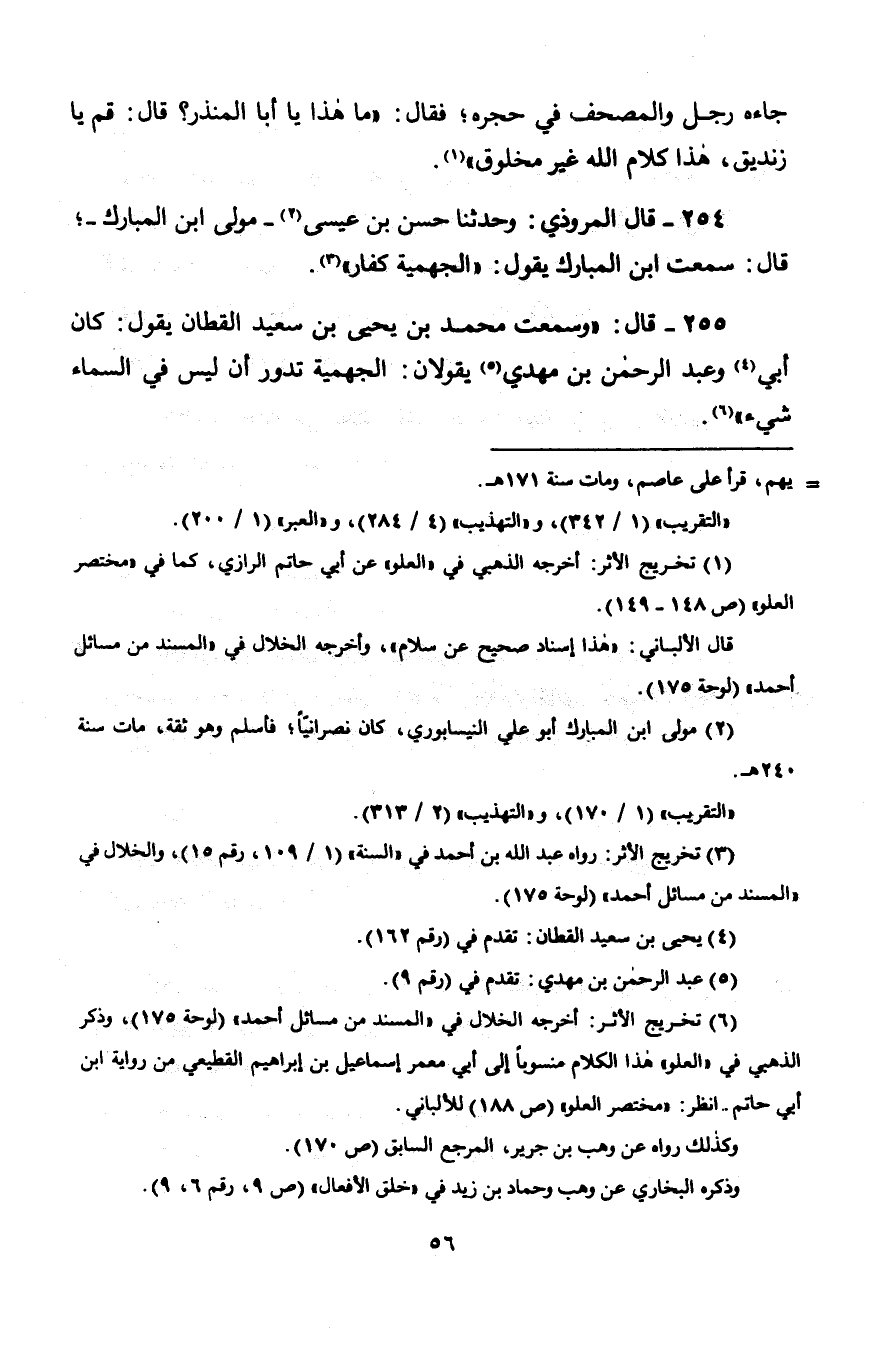 254 - قَالَ الْمَرُّوذِيُّ: وَحَدَّثَنَا حَسَنُ بْنُ عِيسَى، مَوْلَى ابْنِ الْمُبَارَكِ قَالَ: سَمِعْتُ ابْنَ الْمُبَارَكِ، يَقُولُ: § «الْجَهْمِيَّةُ كُفَّارٌ»