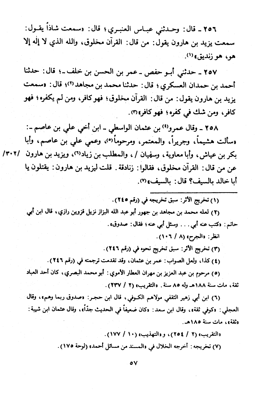 257 - حَدَّثَنِي أَبُو حَفْصٍ عُمَرُ بْنُ الْحَسَنِ بْنِ خَلَفٍ، قَالَ: حَدَّثَنَا أَحْمَدُ بْنُ حَمْدَانَ الْعَسْكَرِيُّ، قَالَ: حَدَّثَنَا مُحَمَّدُ بْنُ مُجَاهِدٍ، قَالَ: سَمِعْتُ يَزِيدَ بْنِ هَارُونَ، يَقُولُ: " §مَنْ قَالَ: الْقُرْآنُ مَخْلُوقٌ فَهُوَ كَافِرٌ، وَمَنْ لَمْ يُكَفِّرْهُ فَهُوَ كَافِرٌ، وَمَنْ شَكَّ فِي كُفْرِهِ فَهُوَ كَافِرٌ "