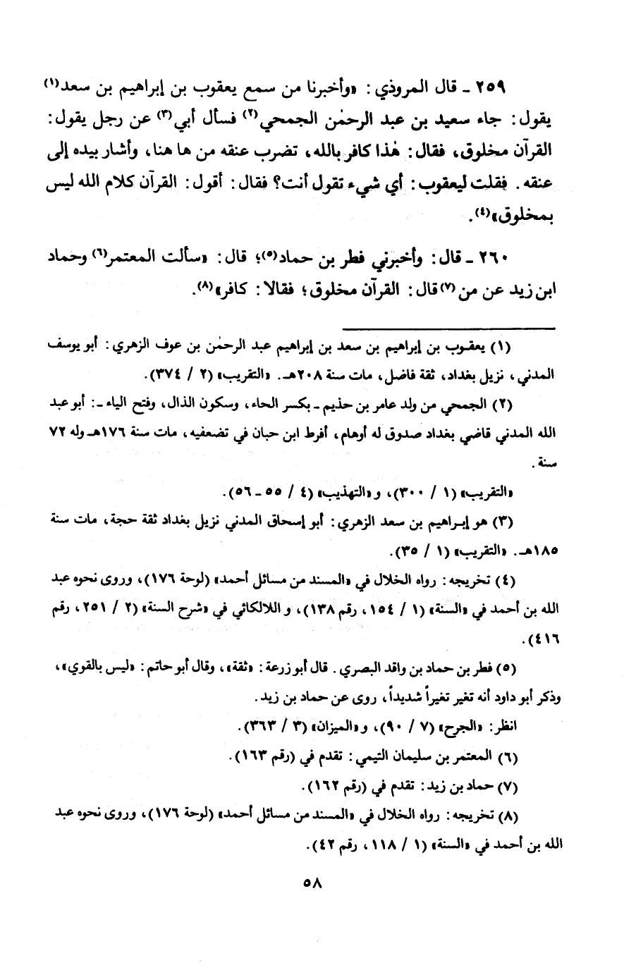 259 - قَالَ الْمَرُّوذِيُّ: وَأَخْبَرَنَا مَنْ سَمِعَ يَعْقُوبَ بْنَ إِبْرَاهِيمَ بْنِ سَعْدٍ، يَقُولُ: جَاءَ سَعِيدُ بْنُ عَبْدِ الرَّحْمَنِ الْجُمَحِيُّ، فَسَأَلَ أَبِي عَنْ رَجُلٍ، يَقُولُ: الْقُرْآنُ مَخْلُوقٌ، فَقَالَ: «هَذَا كَافِرٌ بِاللَّهِ تُضْرَبُ عُنُقُهُ مِنْ هَاهُنَا، وَأَشَارَ بِيَدِهِ إِلَى عُنُقِهِ» فَقُلْتُ لِيَعْقُوبَ: أَيُّ شَيْءٍ تَقُولُ أَنْتَ؟ فَقَالَ: أَقُولُ: § «الْقُرْآنُ كَلَامُ اللَّهِ لَيْسَ بِمَخْلُوقٍ»