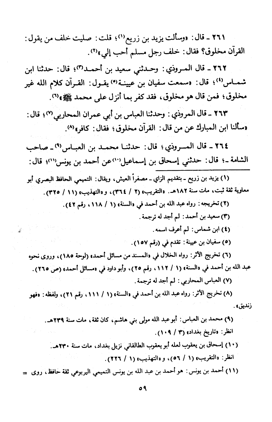 261 - قَالَ: وَسَأَلْتُ يَزِيدَ بْنِ زُرَيْعٍ، قُلْتُ: " §صَلَّيْتُ خَلْفَ مَنْ يَقُولُ: الْقُرْآنُ مَخْلُوقٌ؟ فَقَالَ: خَلْفَ رَجُلٍ مُسْلِمٍ أَحَبُّ إِلَيَّ "