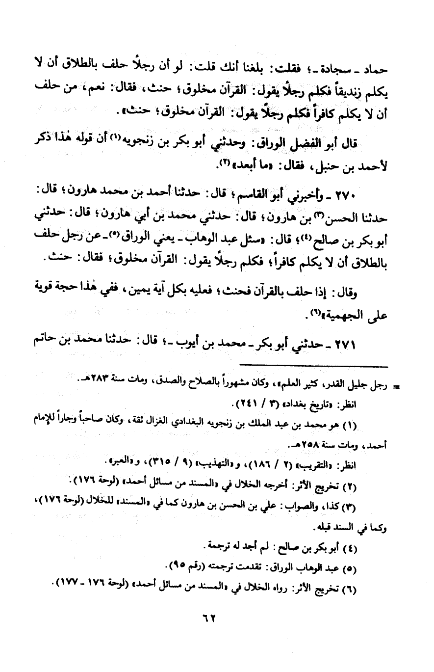 270 - وَأَخْبَرَنِي أَبُو الْقَاسِمِ، قَالَ: حَدَّثَنَا أَحْمَدُ بْنُ مُحَمَّدٍ هَارُونُ، قَالَ: حَدَّثَنَا الْحَسَنُ بْنُ هَارُونَ، قَالَ: حَدَّثَنِي مُحَمَّدُ بْنُ أَبِي هَارُونَ، قَالَ: حَدَّثَنِي أَبُو بَكْرِ بْنُ صَالِحٍ، قَالَ: سُئِلَ عَبْدُ الْوَهَّابِ يَعْنِي الْوَرَّاقَ عَنْ " §رَجُلٍ حَلَفَ بِالطَّلَاقِ أَنْ لَا يُكَلِّمَ كَافِرًا، فَكَلَّمَ رَجُلًا يَقُولُ: الْقُرْآنُ مَخْلُوقٌ، فَقَالَ: حَنِثَ وَقَالَ: «إِذَا حَلَفَ بِالْقُرْآنِ فَحَنِثَ، فَعَلَيْهِ بِكُلِّ آيَةٍ يَمِينٌ، فَفِي هَذَا حُجَّةٌ قَوِيَّةٌ عَلَى الْجَهْمِيَّةِ»