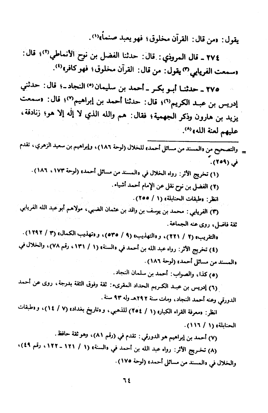 274 - قَالَ الْمَرُّوذِيُّ: قَالَ: حَدَّثَنَا الْفَضْلُ بْنُ نُوحٍ الْأَنْمَاطِيُّ، قَالَ: سَمِعْتُ الْفِرْيَابِيَّ، يَقُولُ: " §مَنْ قَالَ: الْقُرْآنُ مَخْلُوقٌ فَهُوَ كَافِرٌ "