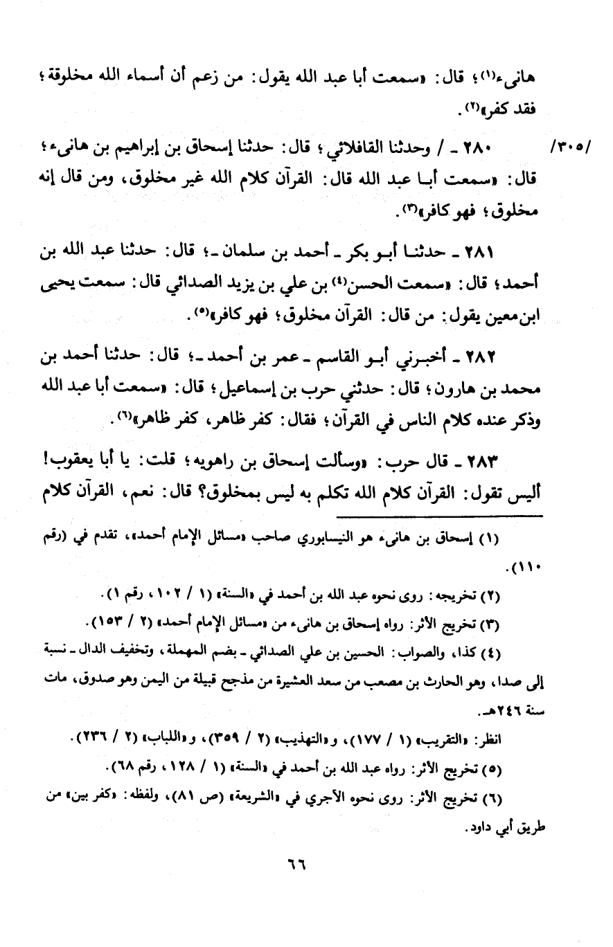 280 - وَحَدَّثَنَا الْقَافْلَائِي، قَالَ: حَدَّثَنَا إِسْحَاقُ بْنُ إِبْرَاهِيمَ بْنِ هَانِئٍ، قَالَ: سَمِعْتُ أَبَا عَبْدِ اللَّهِ، قَالَ: " §الْقُرْآنُ كَلَامُ اللَّهِ غَيْرُ مَخْلُوقٍ، وَمَنْ قَالَ: إِنَّهُ مَخْلُوقٌ فَهُوَ كَافِرٌ "