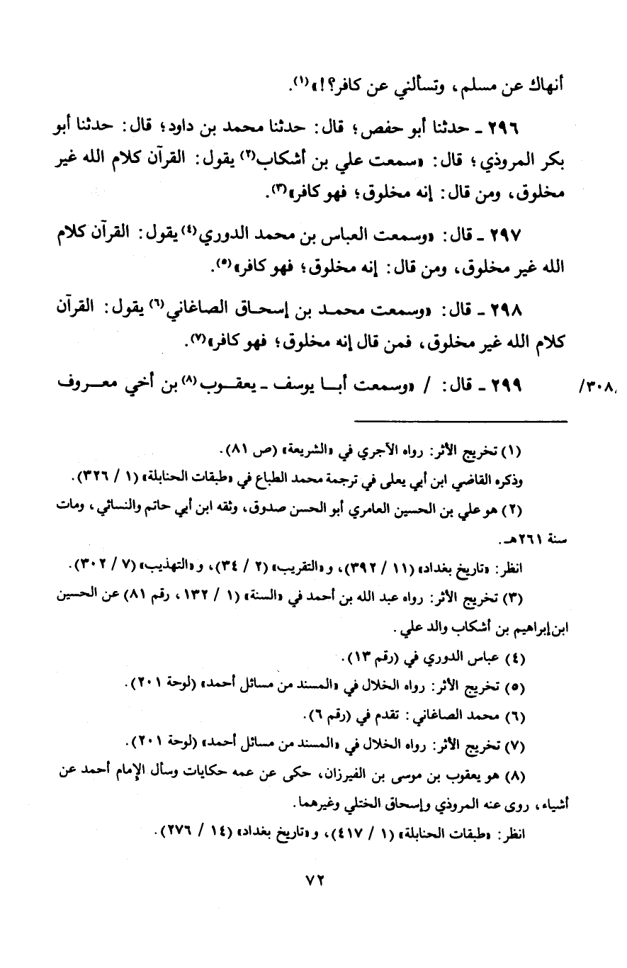 299 - قَالَ: وَسَمِعْتُ أَبَا يُوسُفَ يَعْقُوبَ ابْنَ أَخِي مَعْرُوفٍ -[73]- الْكَرْخِيِّ يَقُولُ: " §الْقُرْآنُ كَلَامُ اللَّهِ غَيْرُ مَخْلُوقٍ، وَمَنْ قَالَ: إِنَّهُ مَخْلُوقٌ، فَهُوَ كَافِرٌ "