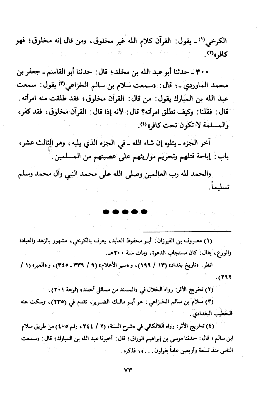300 - حَدَّثَنَا أَبُو عَبْدِ اللَّهِ بْنُ مَخْلَدٍ، قَالَ: حَدَّثَنَا أَبُو الْقَاسِمِ جَعْفَرُ بْنُ مُحَمَّدٍ الْمَاوَرْدِيُّ، قَالَ: سَمِعْتُ سَلَّامَ بْنَ سَالِمٍ الْخُزَاعِيَّ، يَقُولُ: سَمِعْتُ عَبْدَ اللَّهِ بْنَ الْمُبَارَكِ، يَقُولُ: " §مَنْ قَالَ: الْقُرْآنُ مَخْلُوقٌ، فَقَدْ طُلِّقَتْ مِنْهُ امْرَأَتُهُ ". قَالَ: فَقُلْنَا: وَكَيْفَ تُطَلَّقُ امْرَأَتُهُ؟ قَالَ: " لِأَنَّهُ إِذَا قَالَ: الْقُرْآنُ مَخْلُوقٌ، فَقَدْ كَفَرَ، وَالْمُسْلِمَةُ لَا تَكُونُ تَحْتَ كَافِرٍ "