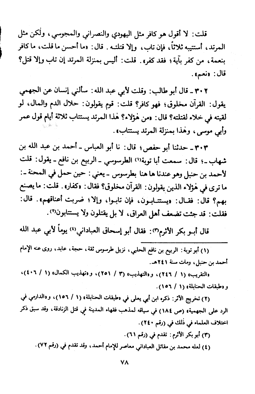302 - قَالَ أَبُو طَالِبٍ: وَقُلْتُ لِأَبِي عَبْدِ اللَّهِ: §سَأَلَنِي إِنْسَانٌ عَنِ الْجَهْمِيِّ يَقُولُ: الْقُرْآنُ مَخْلُوقٌ، فَهُوَ كَافِرٌ؟ قُلْتُ قَوْمٌ يَقُولُونَ: حَلَالُ الدَّمِ وَالْمَالِ، لَوْ لَقِيتَهُ فِي خَلَاءٍ لَقَتَلْتُهُ؟ قَالَ: مَنْ هَؤُلَاءِ؟ هَذَا الْمُرْتَدُّ يُسْتَتَابُ ثَلَاثَةَ أَيَّامٍ، قَوْلُ عُمَرَ وَأَبِي مُوسَى، وَهَذَا بِمَنْزِلَةِ الْمُرْتَدِّ يُسْتَتَابُ "