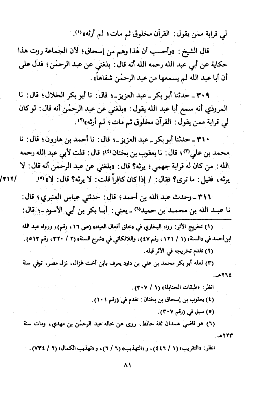 309 - حَدَّثَنَا أَبُو بَكْرٍ عَبْدُ الْعَزِيزِ، قَالَ: نا أَبُو بَكْرٍ الْخَلَّالُ، قَالَ: نا الْمَرُّوذِيُّ، أَنَّهُ سَمِعَ أَبَا عَبْدِ اللَّهِ، يَقُولُ: بَلَغَنِي عَنْ عَبْدِ الرَّحْمَنِ، أَنَّهُ قَالَ: " §لَوْ كَانَ لِي قَرَابَةٌ مِمَّنْ يَقُولُ: الْقُرْآنُ مَخْلُوقٌ ثُمَّ مَاتَ لَمْ أَرِثْهُ "