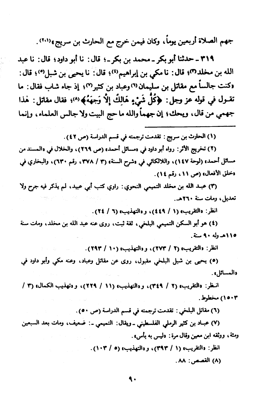 319 - حَدَّثَنَا أَبُو بَكْرٍ مُحَمَّدُ بْنُ بَكْرٍ، قَالَ: نا أَبُو دَاوُدَ، قَالَ: نا عَبْدُ اللَّهِ بْنُ مَخْلَدٍ، قَالَ: نا مَكِّيُّ بْنُ إِبْرَاهِيمَ، قَالَ: نا يَحْيَى بْنُ شِبْلٍ، قَالَ: كُنْتُ جَالِسًا مَعَ مُقَاتِلِ بْنِ سُلَيْمَانَ، وَعَبَّادِ بْنِ كَثِيرٍ إِذْ جَاءِ شَابٌّ فَقَالَ: مَا تَقُولُ فِي قَوْلِهِ عَزَّ وَجَلَّ: {§كُلُّ شَيْءٍ هَالِكٌ إِلَّا وَجْهَهُ} [القصص: 88]، فَقَالَ مُقَاتِلٌ: «هَذَا جَهْمِيٌّ مَنْ قَالَ، وَيْحَكَ، إِنَّ جَهْمًا وَاللَّهِ مَا حَجَّ البَّيْتَ، وَلَا جَالَسَ الْعُلَمَاءَ، وَإِنَّمَا -[91]- كَانَ رَجُلًا أُعْطِيَ لِسَانًا»