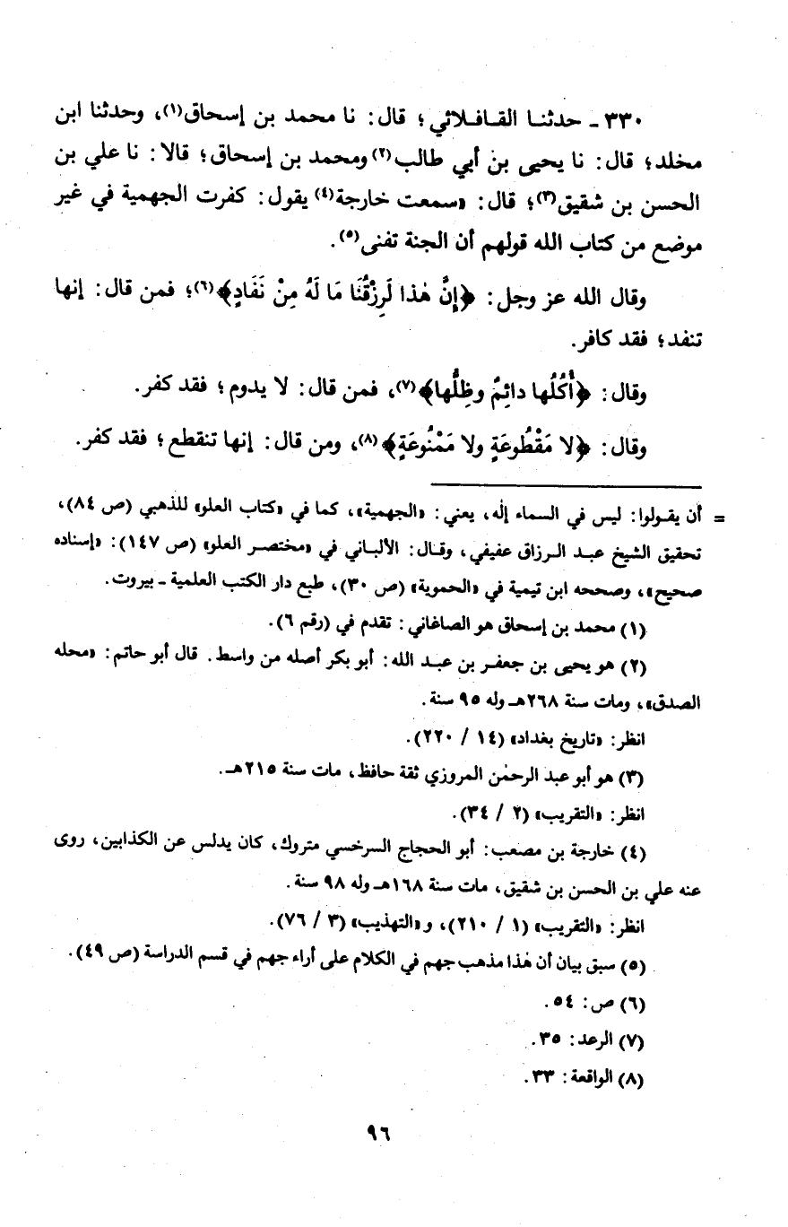 330 - حَدَّثَنَا الْقَافْلَائِي، قَالَ: نا مُحَمَّدُ بْنُ إِسْحَاقَ، وَحَدَّثَنَا ابْنُ مَخْلَدٍ، قَالَ: نا يَحْيَى بْنُ أَبِي طَالِبٍ، وَمُحَمَّدُ بْنُ إِسْحَاقَ، قَالَا: نا عَلِيُّ بْنُ الْحَسَنِ بْنِ شَقِيقٍ، قَالَ: سَمِعْتُ خَارِجَةَ، يَقُولُ: " §كَفَرَتِ الْجَهْمِيَّةُ فِي غَيْرِ مَوْضِعٍ مِنْ كِتَابِ اللَّهِ، قَوْلُهُمْ أَنَّ الْجَنَّةَ تَفْنَى. وَقَالَ اللَّهُ عَزَّ وَجَلَّ: {إِنَّ هَذَا لَرِزْقُنَا مَا لَهُ مِنْ نَفَادٍ} [ص: 54]، فَمَنْ قَالَ: إِنَّهَا تَنْفَدُ فَقَدْ كَفَرَ، وَقَالَ {أُكُلُهَا دَائِمٌ وَظِلُّهَا} [الرعد: 35]، فَمَنْ قَالَ: لَا يَدُومُ، فَقَدْ كَفَرَ. وَقَالَ: {لَا مَقْطُوعَةٍ وَلَا مَمْنُوعَةٍ} [الواقعة: 33]، وَمَنْ قَالَ: إِنَّهَا تَنْقَطِعُ فَقَدْ كَفَرَ. -[97]- وَقَالَ {عَطَاءً غَيْرَ مَجْذُوذٍ} [هود: 108]، فَمَنْ قَالَ إِنَّهَا تَنْقَطِعُ فَقَدْ كَفَرَ "