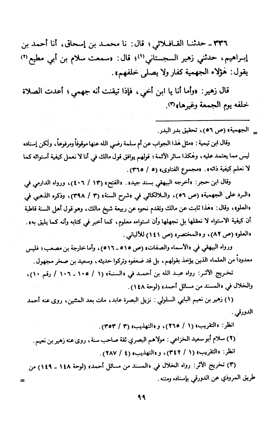 336 - حَدَّثَنَا الْقَافْلَائِي، قَالَ: نا مُحَمَّدُ بْنُ إِسْحَاقَ، أنا أَحْمَدُ بْنُ إِبْرَاهِيمَ، حَدَّثَنِي زُهَيْرٌ السِّجِسْتَانِيُّ، قَالَ: سَمِعْتُ سَلَّامَ بْنَ أَبِي مُطِيعٍ، يَقُولُ: «§هَؤُلَاءِ الْجَهْمِيَّةُ كُفَّارٌ وَلَا يُصَلَّى خَلْفَهُمْ»، قَالَ زُهَيْرٌ: وَأَمَّا أَنَا يَا ابْنَ أَخِي فَإِذَا تَيَقَّنْتُ أَنَّهُ جَهْمِيٌّ أَعَدْتُ الصَّلَاةَ خَلْفَهُ يَوْمَ الْجُمُعَةِ وَغَيْرِهَا