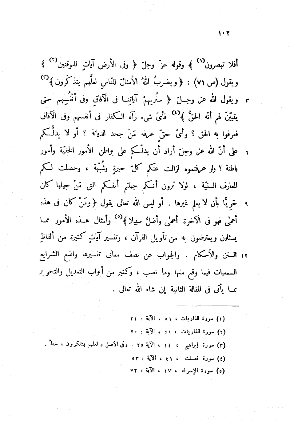 {أَفَلا تُبْصِرُونَ}) وقوله عزّ وجلّ ({وَفِي الْأَرْضِ آياتٌ لِلْمُوقِنِينَ}) ويقول (ص 71): ({وَيَضْرِبُ اللهُ الْأَمْثالَ لِلنّاسِ لَعَلَّهُمْ يَتَذَكَّرُونَ}) ويقول الله عز وجلّ ({سَنُرِيهِمْ آياتِنا فِي الْآفاقِ وَفِي أَنْفُسِهِمْ حَتّى يَتَبَيَّنَ لَهُمْ أَنَّهُ الْحَقُّ}) فأىّ شئ رآه الكفار فى أنفسهم وفى الآفاق فعرفوا به الحق؟ وأىّ حقّ عرفه من جحد الديانة؟ أو لا يدلّكم على أنّ الله عز وجلّ أراد أن يدلّكم على بواطن الأمور الخفيّة وأمور باطنة؟ ولو عرفتموه لزالت عنكم كلّ حيرة وشبهة، وحصلت لكم المعارف السنيّة، لولا ترون أنكم جهلتم أنفسكم التى من جهلها كان حريّا بأن لا يعلم غيرها. أو ليس الله تعالى يقول ({وَمَنْ كانَ فِي هذِهِ أَعْمى فَهُوَ فِي الْآخِرَةِ أَعْمى وَأَضَلُّ سَبِيلاً}) وأمثال هذه الأمور مما يسئلون ويعترضون به من تأويل القرآن، وتفسير آيات كثيرة من ألفاظ السنن والأحكام. والجواب عن نصف معانى تفسيرها واضع الشرايع السمعيات فيما وقع منها وما نصب، وكثير من أبواب التعديل والتحوير مما يأتى فى المقالة الثانية إن شاء الله تعالى.