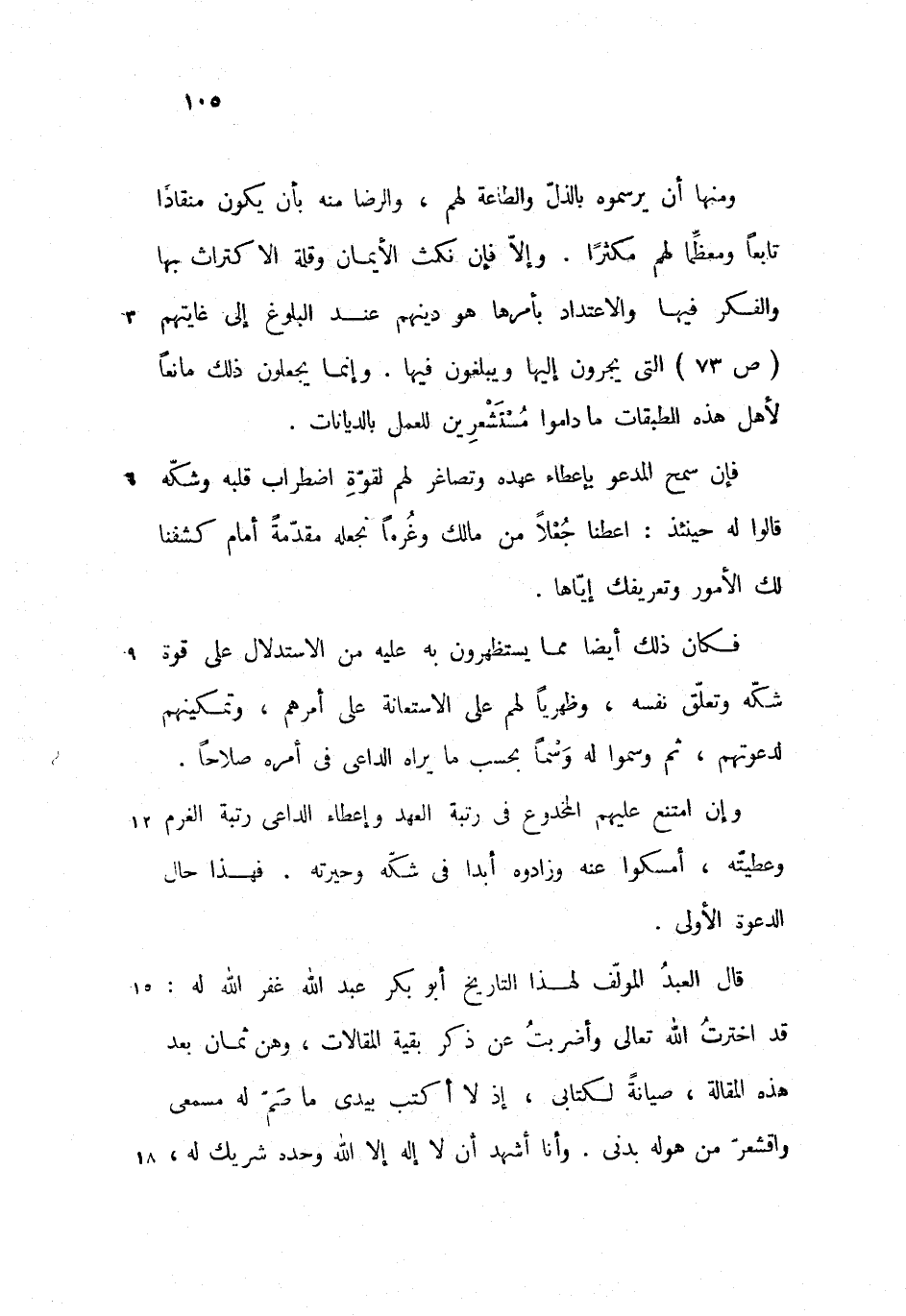 ومنها أن يرسموه بالذلّ والطاعة لهم، والرضا منه بأن يكون منقادا تابعا ومعظّما لهم مكثرا. وإلاّ فإن نكث الأيمان وقلة الاكتراث بها والفكر فيها والاعتداد بأمرها هو دينهم عند البلوغ إلى غايتهم (ص 73) التى يجرون إليها ويبلغون فيها. وإنما يجعلون ذلك مانعا لأهل هذه الطبقات ما داموا مستشعرين للعمل بالديانات.