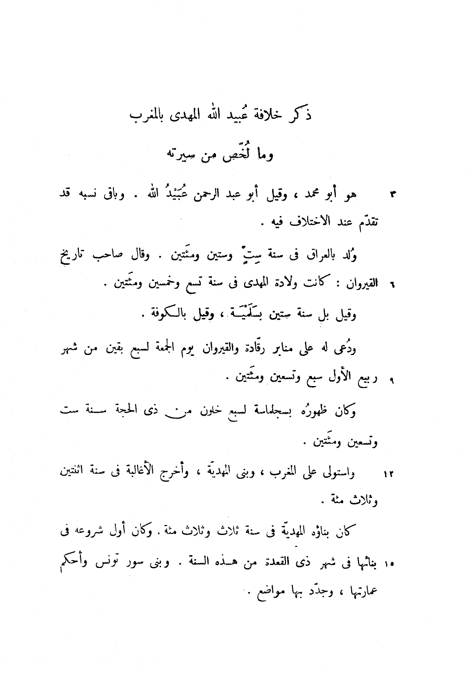 كان بناؤه المهديّة فى سنة ثلاث وثلاث مئة. وكان أول شروعه فى بنائها فى شهر ذى القعدة من هذه السنة. وبنى سور تونس وأحكم عمارتها، وجدّد بها مواضع.