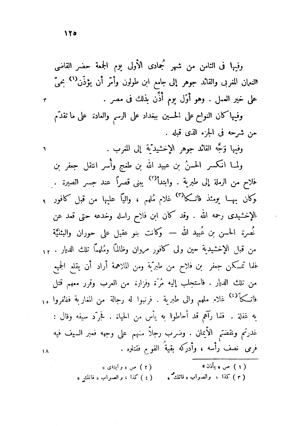 وفيها فى الثامن من شهر جمادى الأولى يوم الجمعة حضر القاضى النعمان المغربى والقائد جوهر إلى جامع ابن طولون وأمّر أن يؤذّن بحىّ على خير العمل. وهو أوّل يوم أذّن بذلك فى مصر.