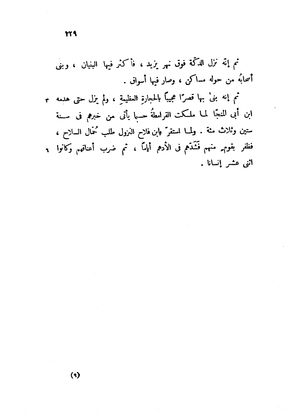 ثم إنه بنى بها قصرا عجيبا بالحجارة العظيمة، ولم يزل حتى هدمه ابن أبى المنجّا لما ملكت القرامطة حسبما يأتى من خبرهم فى سنة ستين وثلاث مئة. ولما استقرّ بابن فلاح النزول طلب حمّال السلاح، فظفر بقوم منهم فشدّهم فى الأدهم أياما، ثم ضرب أعناقهم وكانوا اثنى عشر إنسانا.