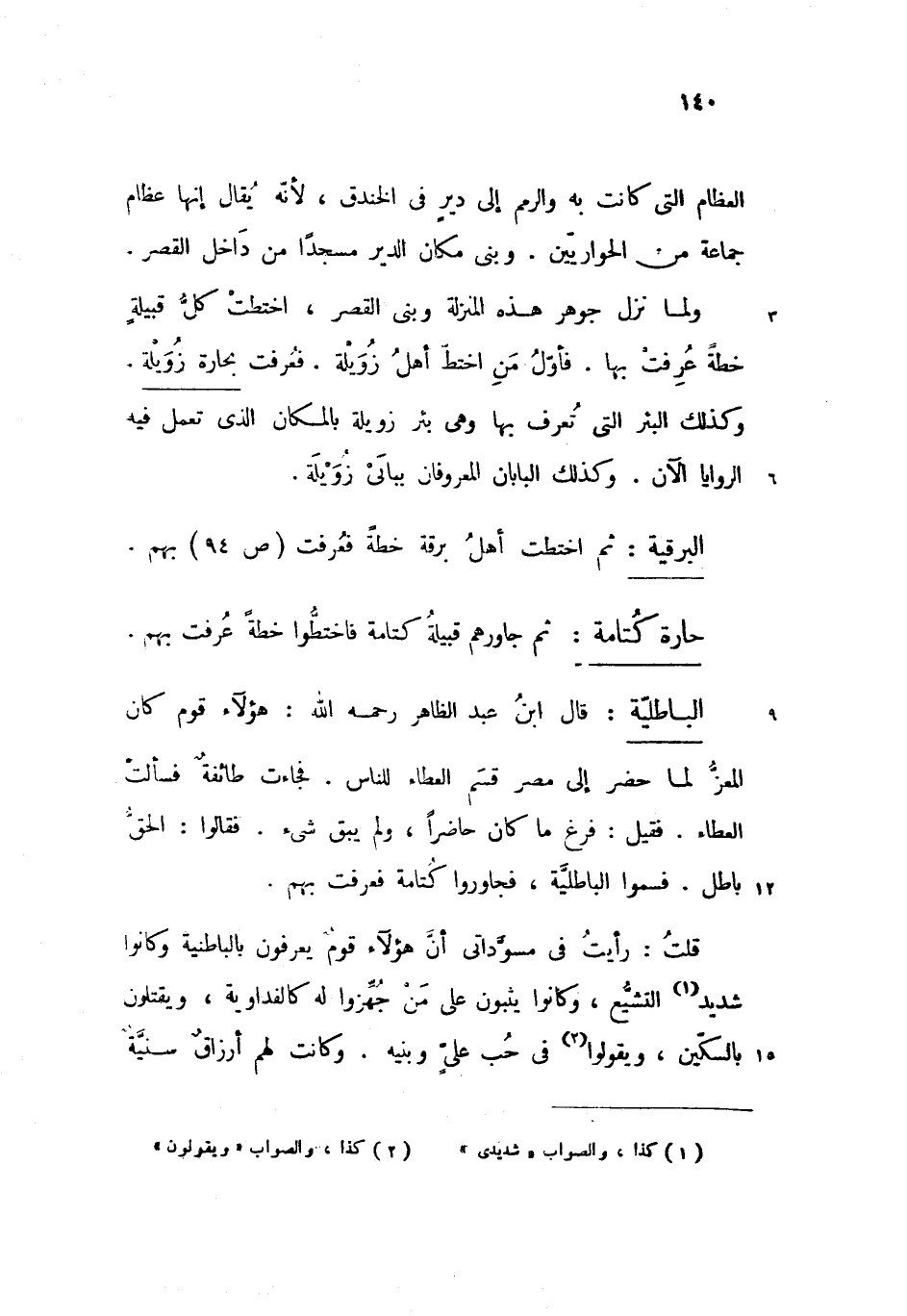 قلت: رأيت فى مسوّداتى أنّ هؤلآء قوم يعرفون بالباطنية وكانوا شديد التشيّع، وكانوا يثبون على من جهّزوا له كالفداوية، ويقتلون بالسكّين، ويقولوا فى حب علىّ وبنيه. وكانت لهم أرزاق سنيّة