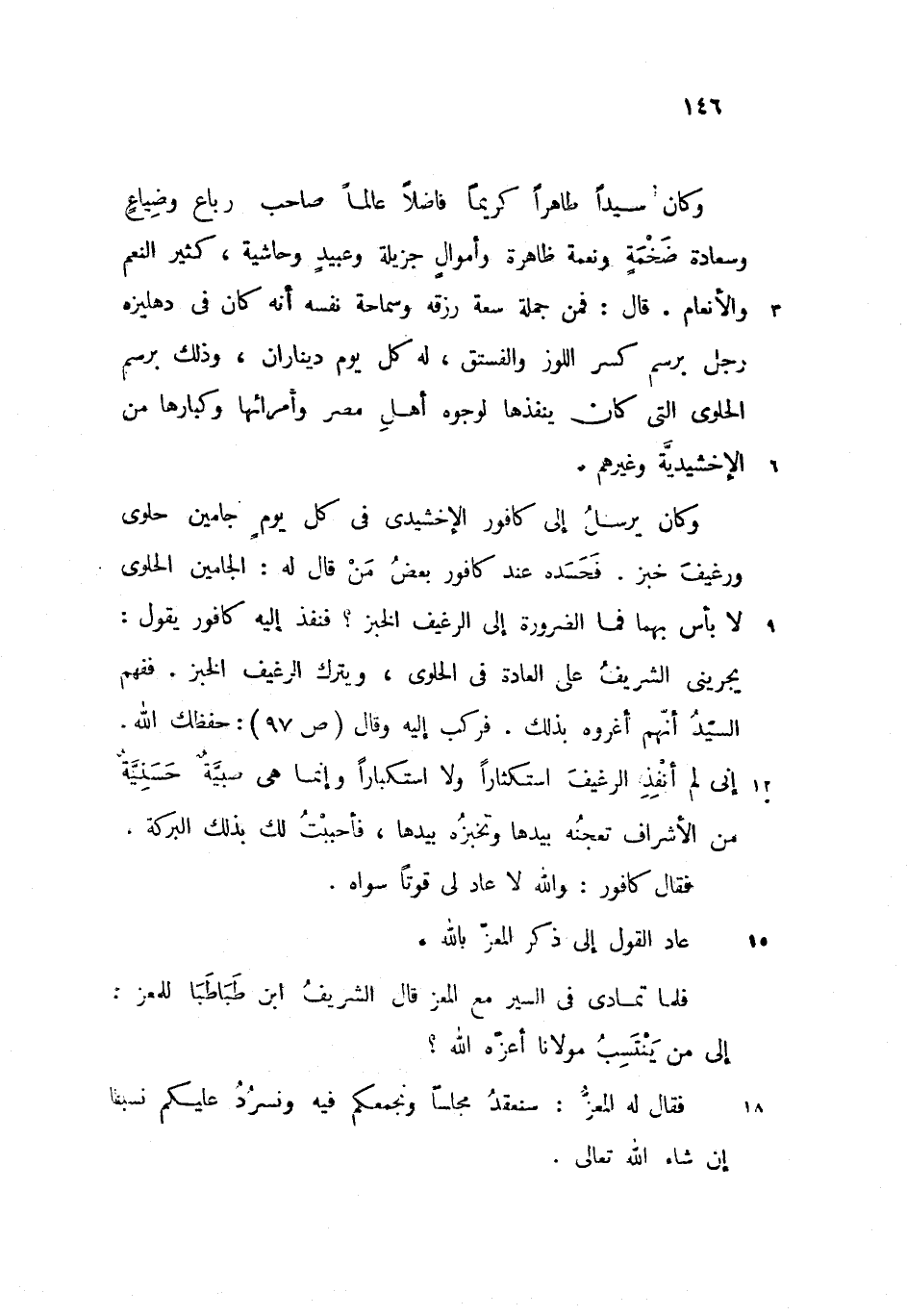 يجرينى الشريف على العادة فى الحلوى، ويترك الرغيف الخبز. ففهم السيّد أنّهم أغروه بذلك. فركب إليه وقال (ص 97): حفظك الله.