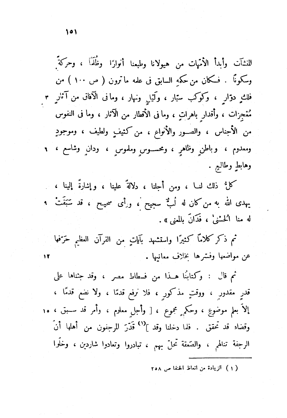 المنشآت وأبدأ الأمّهات من هيولانا وطبعنا أنوارا وظلما، وحركة وسكونا. فكان من حكمه السابق فى علمه ما ترون (ص 100) من فلك دوّار، وكوكب سيّار، وليل ونهار، وما فى الآفاق من آثار معجزات، وأقدار باهرات، وما فى الأقطار من الآثار، وما فى النفوس من الأجناس، والصور والأنواع، من كثيف ولطيف، وموجود ومعدوم، وباطن وظاهر، ومحسوس وملموس، ودان وشاسع، وهابط وطالع.