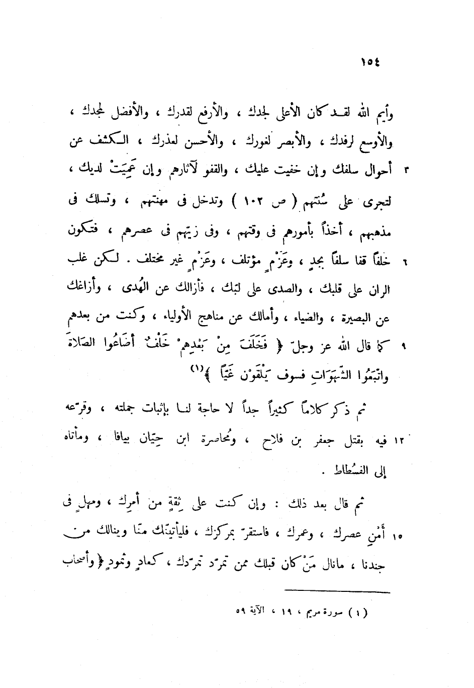 وأيم الله لقد كان الأعلى لجدك، والأرفع لقدرك، والأفضل لمجدك، والأوسع لرفدك، والأبصر لغورك، والأحسن لعذرك، الكشف عن أحوال سلفك وإن خفيت عليك، والقفو لآثارهم وإن عميت لديك، لتجرى على سنتهم (ص 102) وتدخل فى مهنتهم، وتسلك فى مذهبهم، أخذا بأمورهم فى وقتهم، وفى زيّهم فى عصرهم، فتكون خلفا قفا سلفا بجد، وعزم مؤتلف، وعزم غير مختلف. لكن غلب الران على قلبك، والصدى على لبّك، فأزالك عن الهدى، وأزاغك عن البصيرة، والضياء، وأمالك عن مناهج الأولياء، وكنت من بعدهم كما قال الله عز وجلّ ({فَخَلَفَ مِنْ بَعْدِهِمْ خَلْفٌ أَضاعُوا الصَّلاةَ وَاِتَّبَعُوا الشَّهَااتِ فَسَوْفَ يَلْقَوْنَ غَيًّا})