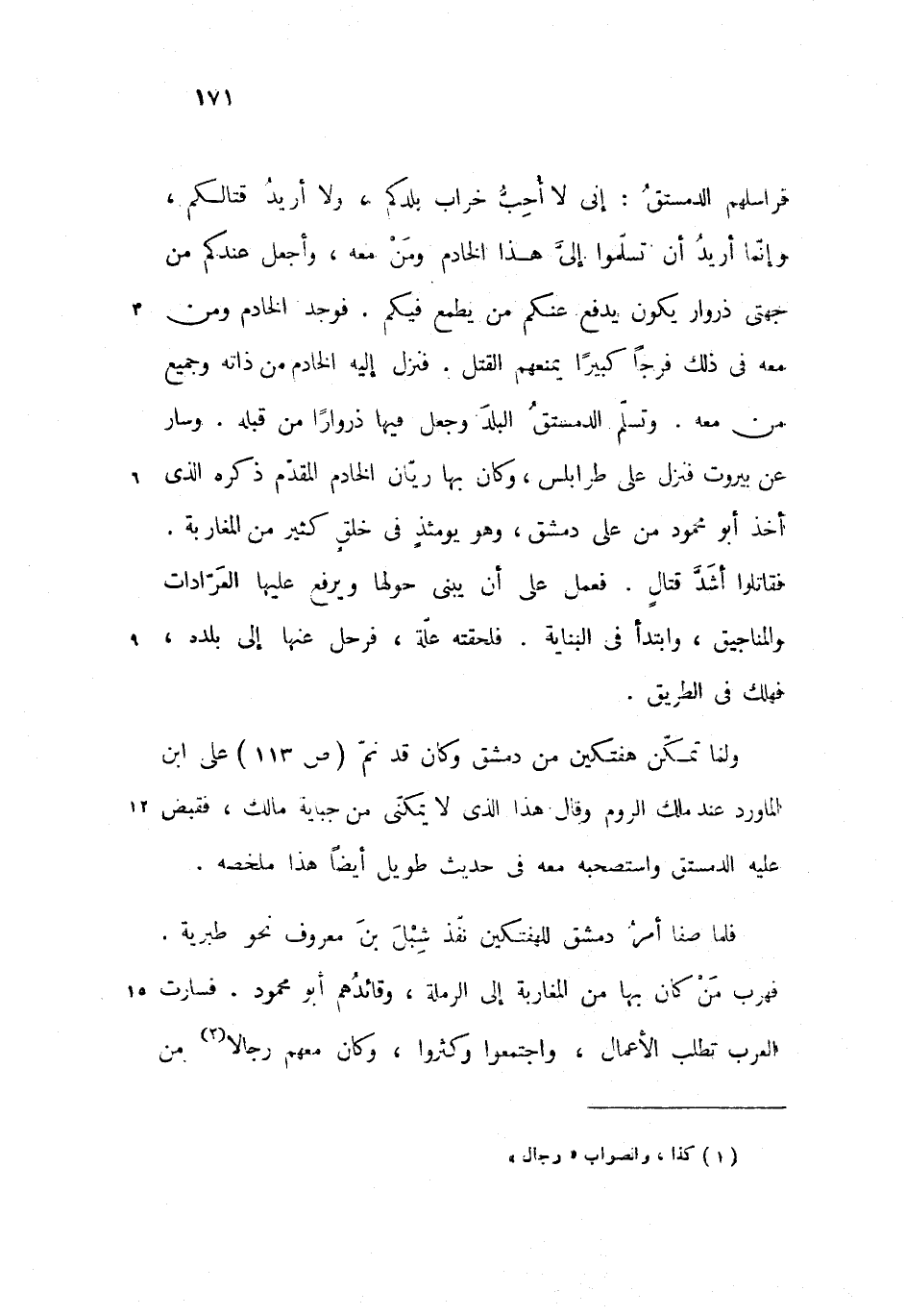 فراسلهم الدمستق: إنى لا أحبّ خراب بلدكم، ولا أريد قتالكم، وإنّما أريد أن تسلّموا إلىّ هذا الخادم ومن معه، وأجعل عندكم من جهتى ذروار يكون يدفع عنكم من يطمع فيكم. فوجد الخادم ومن معه فى ذلك فرجا كبيرا يمنعهم القتل. فنزل إليه الخادم من ذاته وجميع من معه. وتسلّم الدمستق البلد وجعل فيها ذروارا من قبله. وسار عن بيروت فنزل على طرابلس، وكان بها ريّان الخادم المقدّم ذكره الذى أخذ أبو محمود من على دمشق، وهو يومئذ فى خلق كثير من المغاربة.