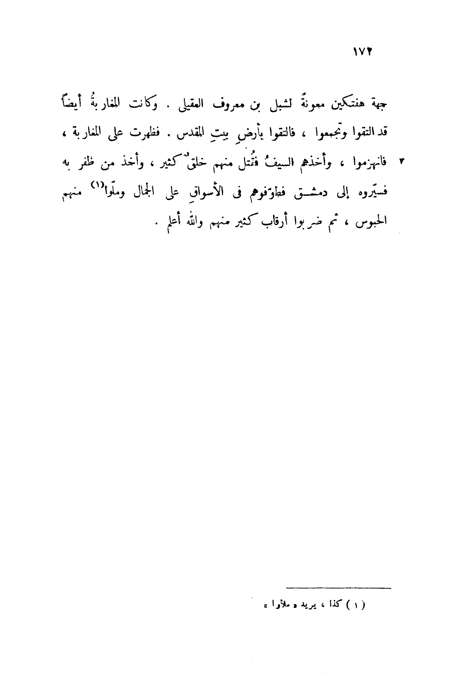 جهة هفتكين معونة لشبل بن معروف العقيلى. وكانت المغاربة أيضا قد التقوا وتجمعوا، فالتقوا بأرض بيت المقدس. فظهرت على المغاربة، فانهزموا، وأخذهم السيف فقتل منهم خلق كثير، وأخذ من ظفر به فسيّروه إلى دمشق فطوّفوهم فى الأسواق على الجمال وملّوا منهم الحبوس، ثم ضربوا أرقاب كثير منهم والله أعلم.