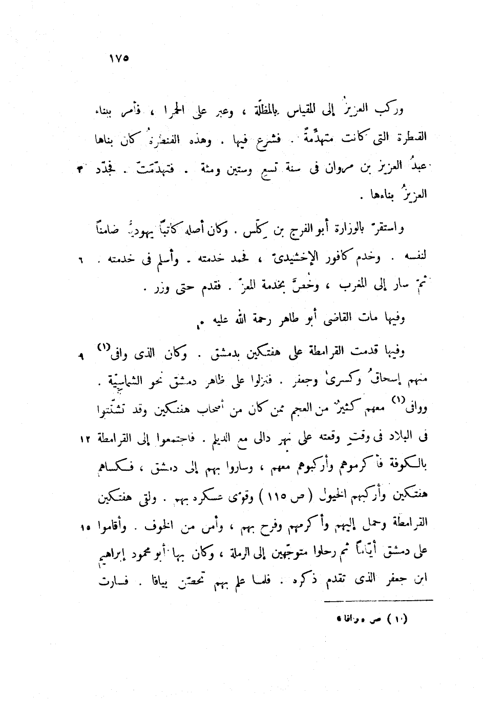 ووافى معهم كثير من العجم ممن كان من أصحاب هفتكين وقد تشتّتوا فى البلاد فى وقت وقعته على نهر دالى مع الديلم. فاجتمعوا إلى القرامطة بالكوفة فأكرموهم وأركبوهم معهم، وساروا بهم إلى دمشق، فكساهم هفتكين وأركبهم الخيول (ص 115) وقوّى عسكره بهم. ولقى هفتكين القرامطة وحمل إليهم وأكرمهم وفرح بهم، وأمن من الخوف. وأقاموا على دمشق أيّاما ثم رحلوا متوجّهين إلى الرملة، وكان بها أبو محمود إبراهيم ابن جعفر الذى تقدم ذكره. فلما علم بهم تحصّن بيافا. فسارت