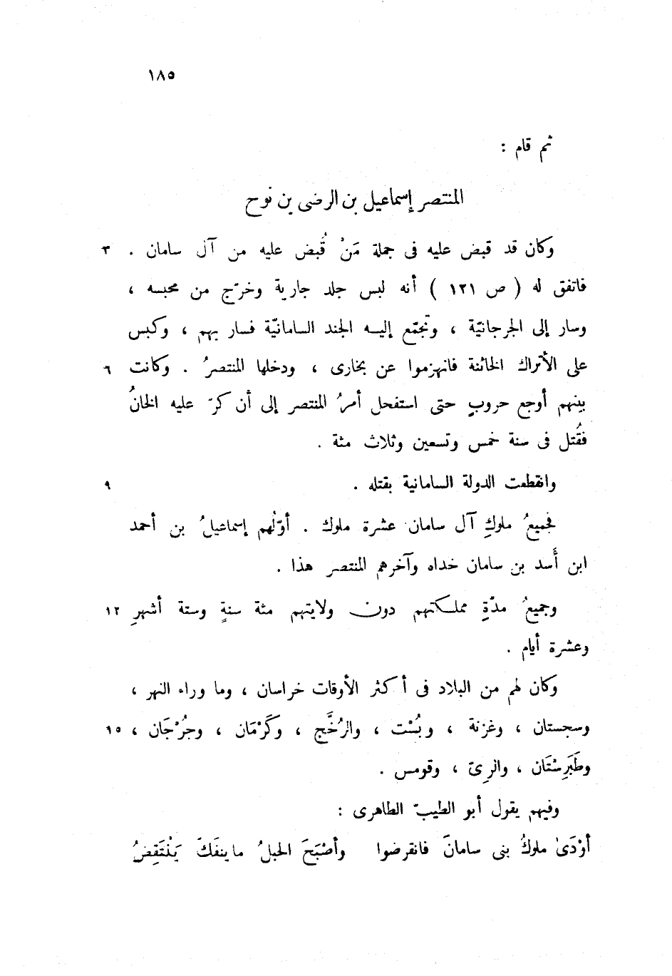 فاتفق له (ص 121) أنه لبس جلد جارية وخرّج من محبسه، وسار إلى الجرجانيّة، وتجمّع إليه الجند السامانيّة فسار بهم، وكبس على الأتراك الخائنة فانهزموا عن بخارى، ودخلها المنتصر. وكانت بينهم أوجع حروب حتى استفحل أمر المنتصر إلى أن كرّ عليه الخان فقتل فى سنة خمس وتسعين وثلاث مئة.