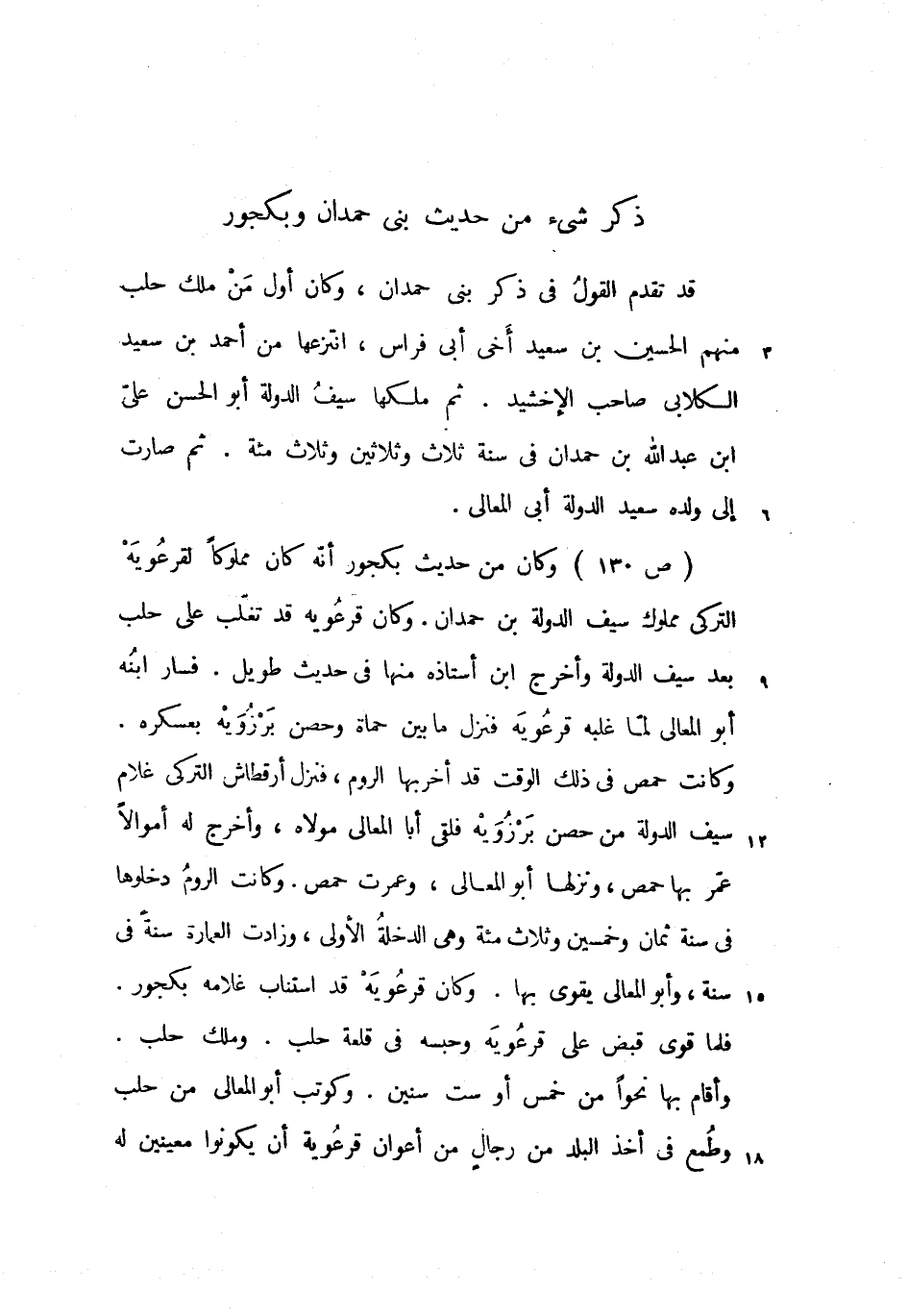 (ص 130) وكان من حديث بكجور أنّه كان مملوكا لقرعويه التركى مملوك سيف الدولة بن حمدان. وكان قرعويه قد تغلّب على حلب بعد سيف الدولة وأخرج ابن أستاذه منها فى حديث طويل. فسار ابنه أبو المعالى لمّا غلبه قرعويه فنزل ما بين حماة وحصن برزويه بعسكره.
