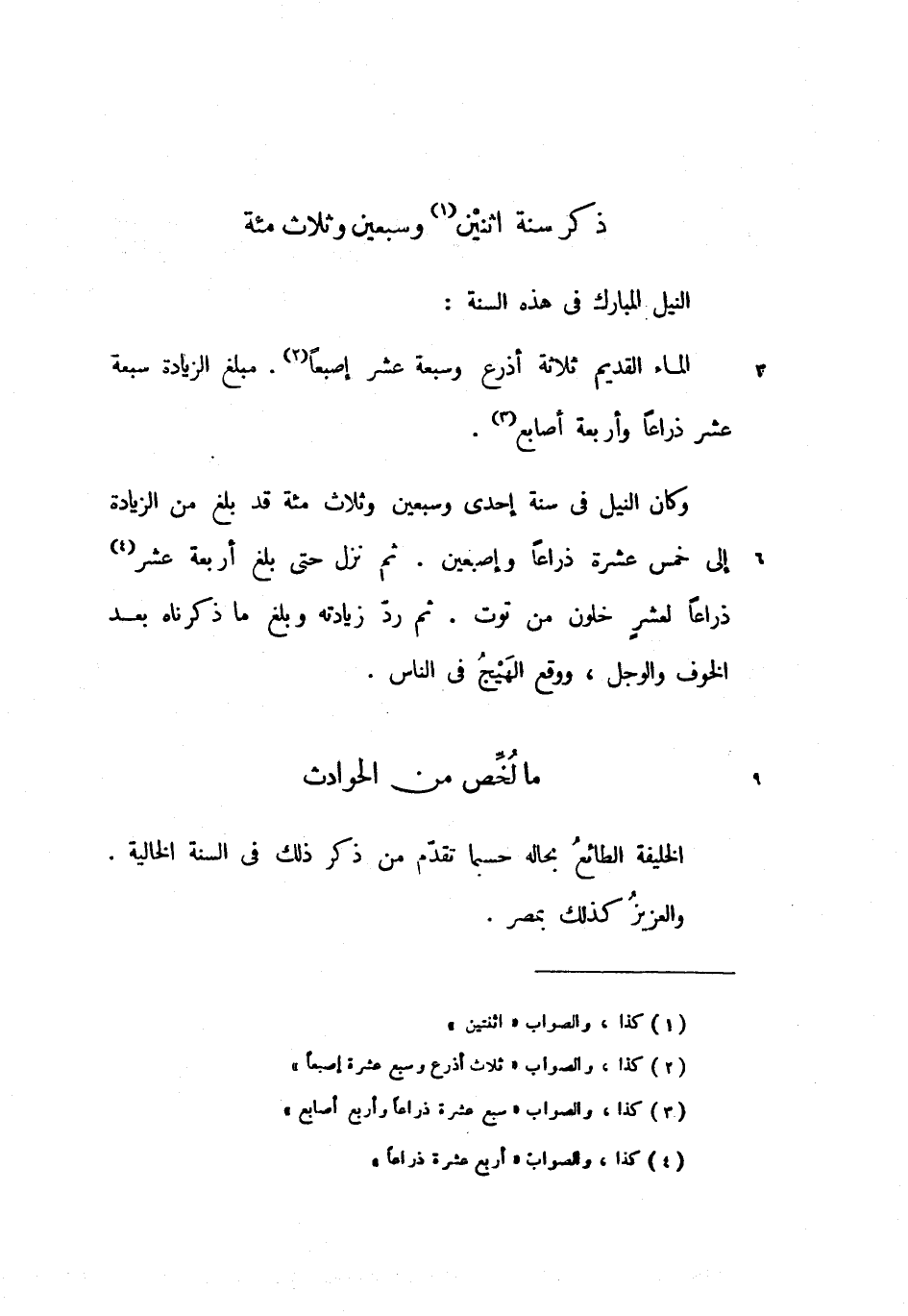 الماء القديم ثلاثة أذرع وسبعة عشر إصبعا. مبلغ الزيادة سبعة عشر ذراعا وأربعة أصابع.